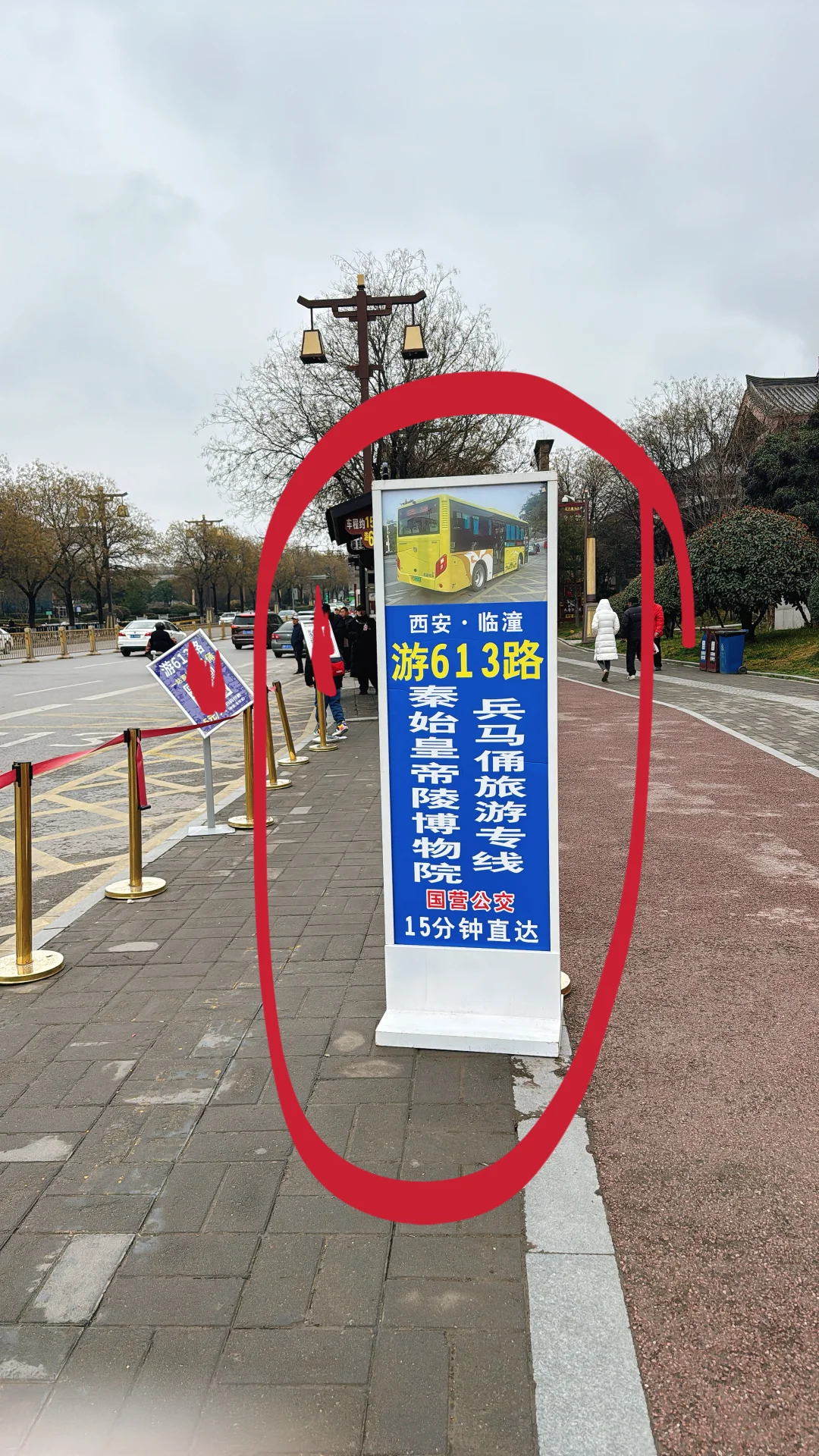 4,一定要从华清池C口出,出来走两步就是613路兵马俑直通车,5块一位,全程15分钟到达兵马俑,中途不停,每5分钟一班车!看图9。