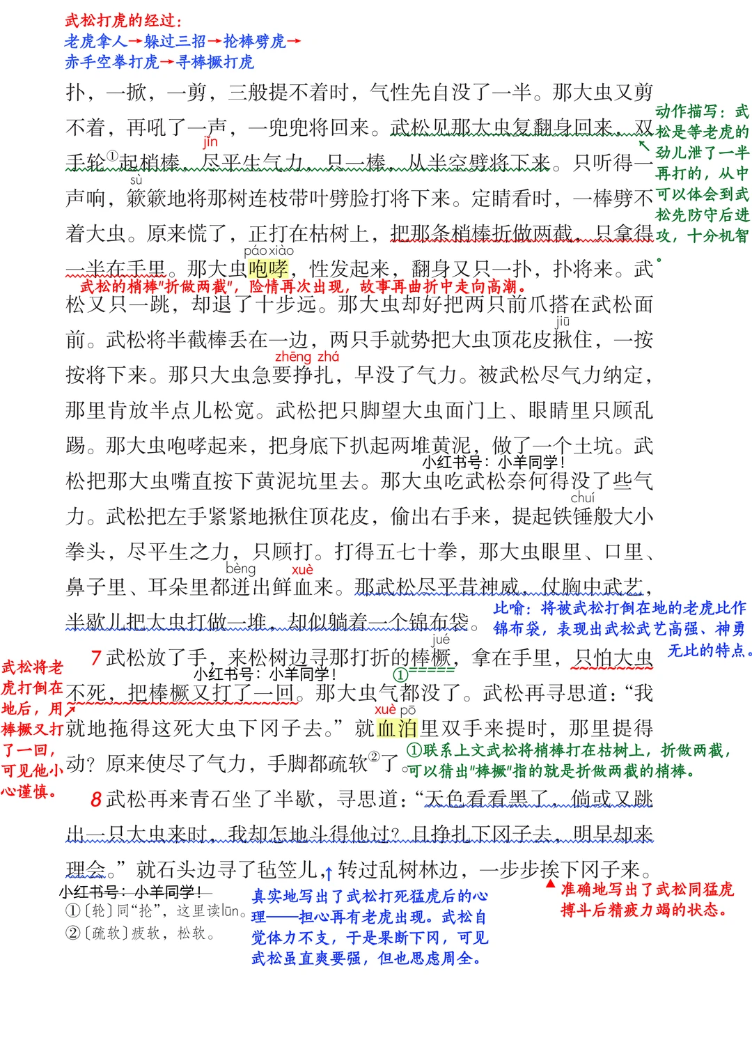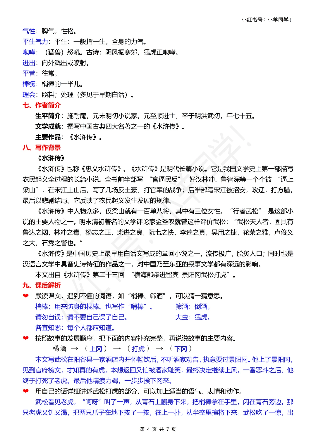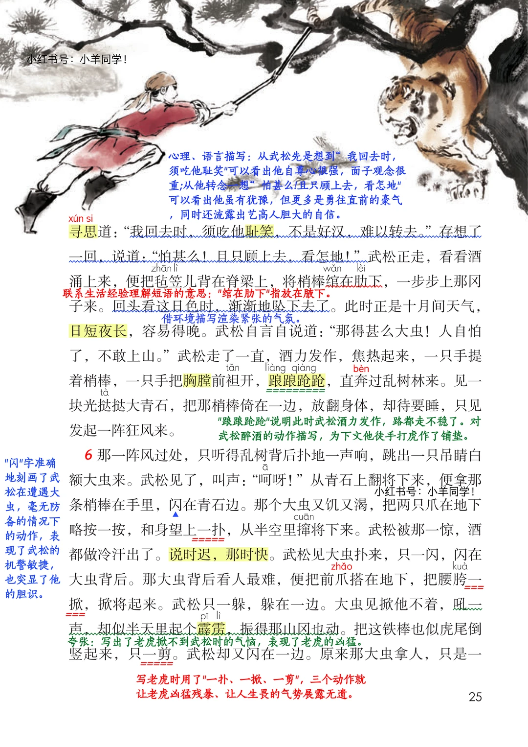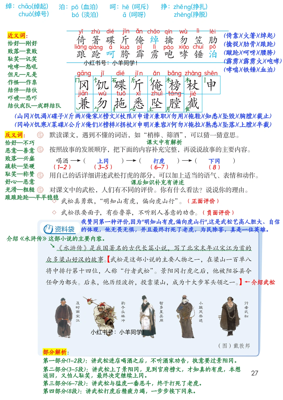 📖 核心学习目标(必掌握) 1️⃣ 生字词:认识20个生字,读准3个多音字,会写15个字+重点词语,默写过关✅ 2️⃣ 阅读:默读时,联系上下文猜不懂的词语意思 3️⃣ 重点💪:按顺序提炼小标题、说主要内容;详细讲述武松打虎(加语气动作) 4️⃣ 拓展:谈谈对武松的看法,尝试阅读《水浒传》原著 💡 提醒:武松打虎细节,阅读理解常考!