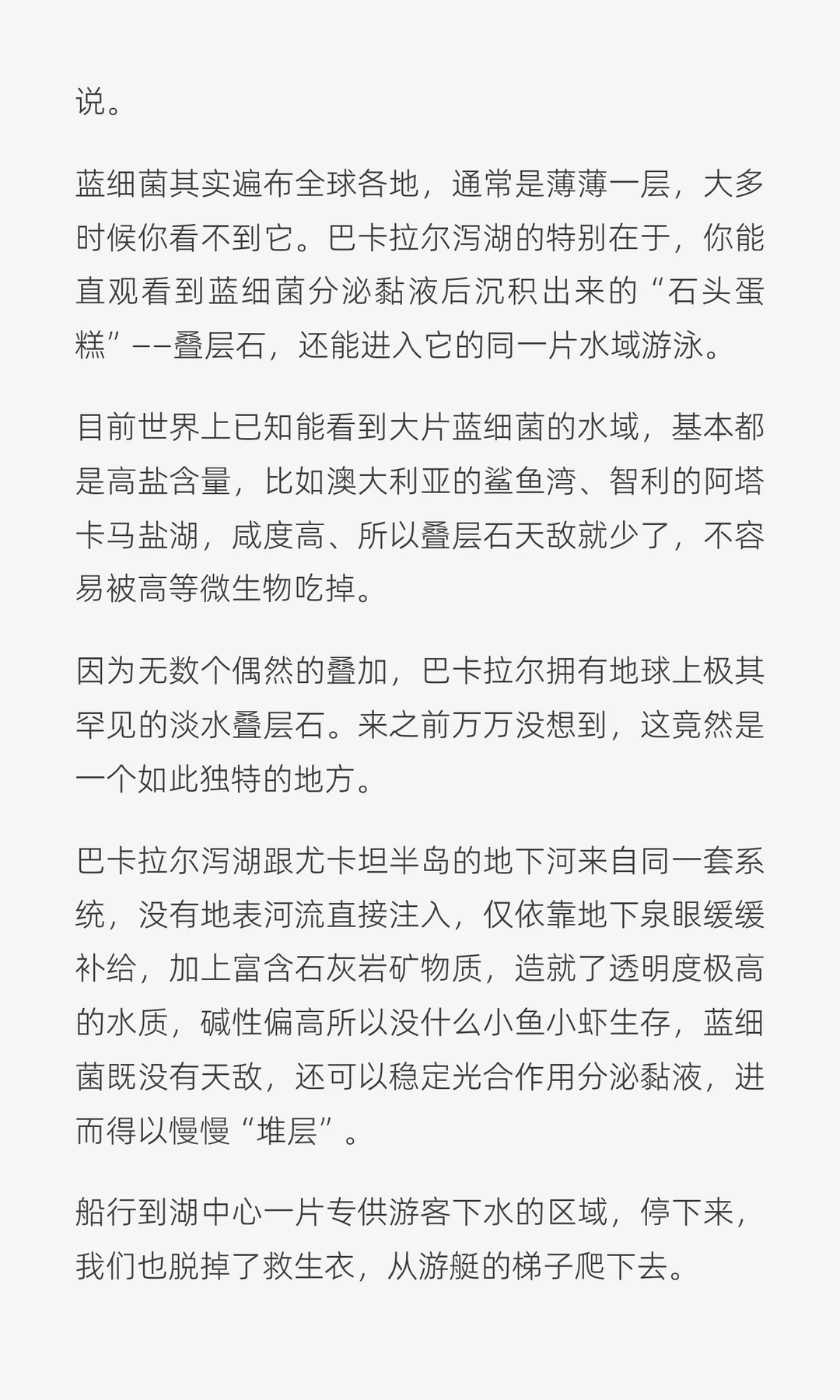船长告诉我们,蓝细菌其实遍布全球各地,通常是薄薄一层,大多时候你看不到它。巴卡拉尔泻湖的特别在于,你能直观看到蓝细菌分泌黏液后沉积出来的“石头蛋糕”——叠层石,还能进入它的同一片水域游泳。