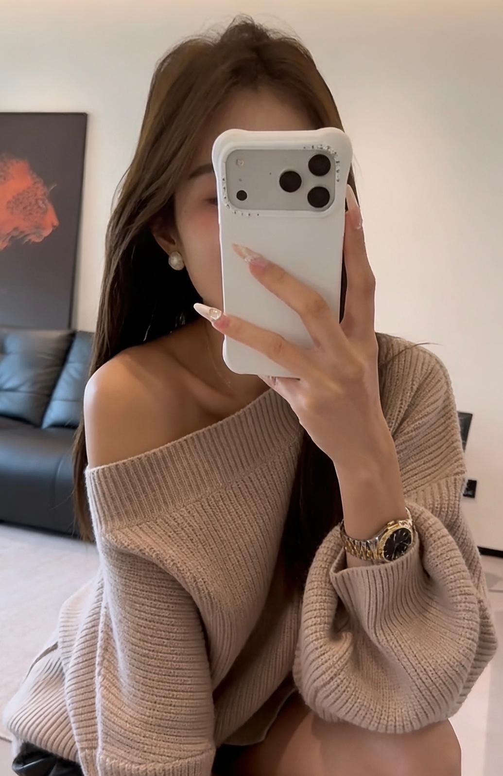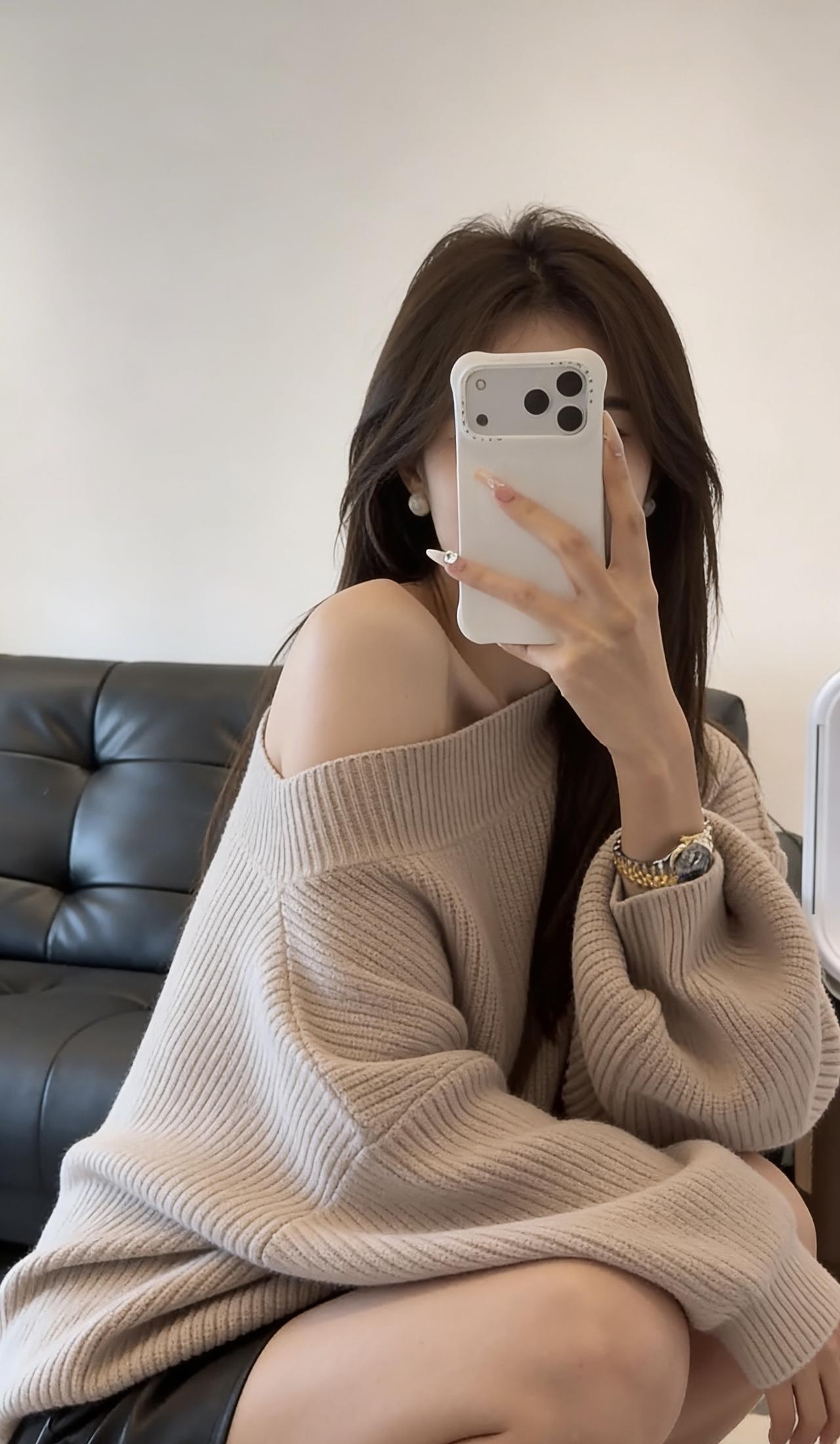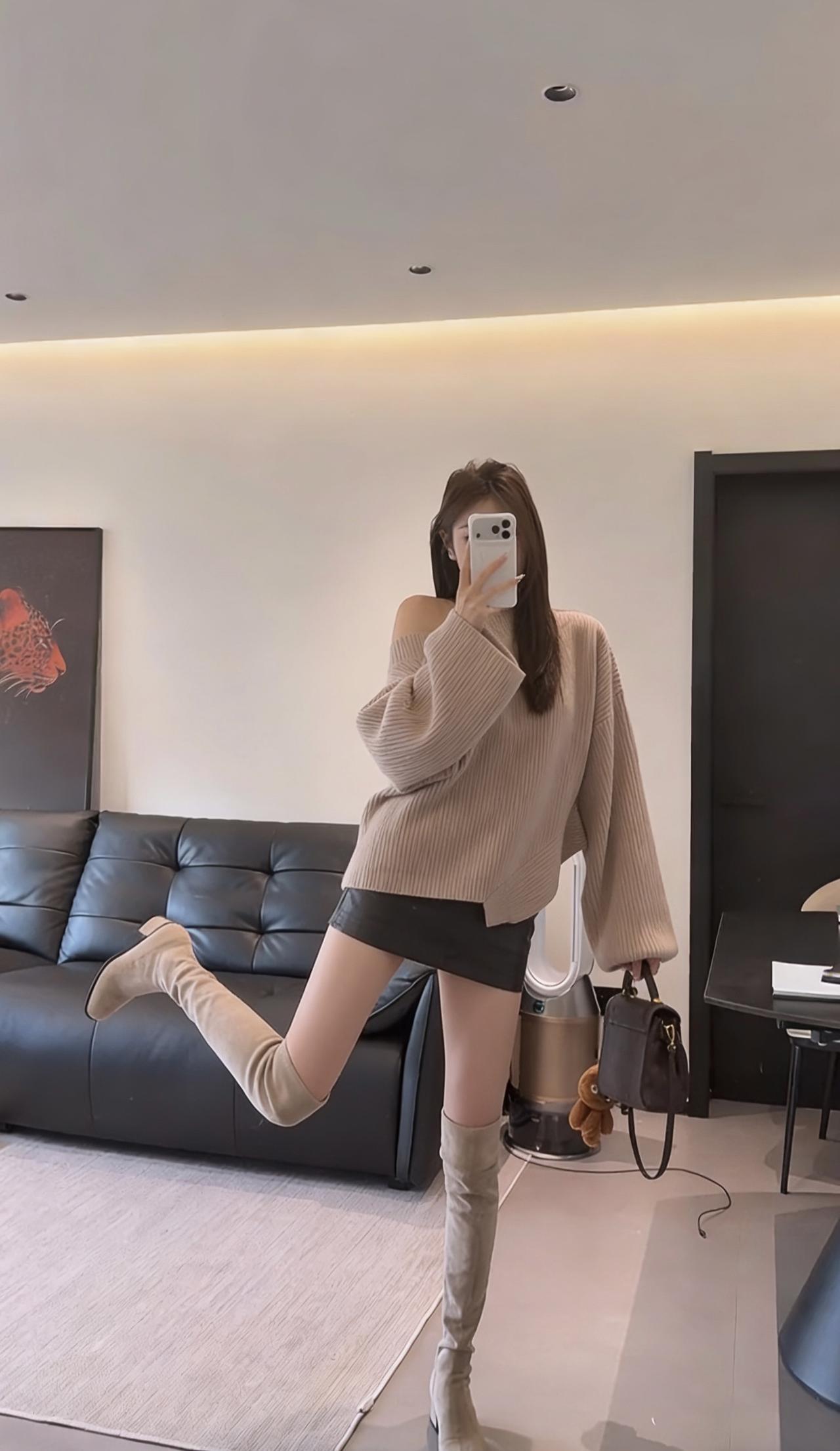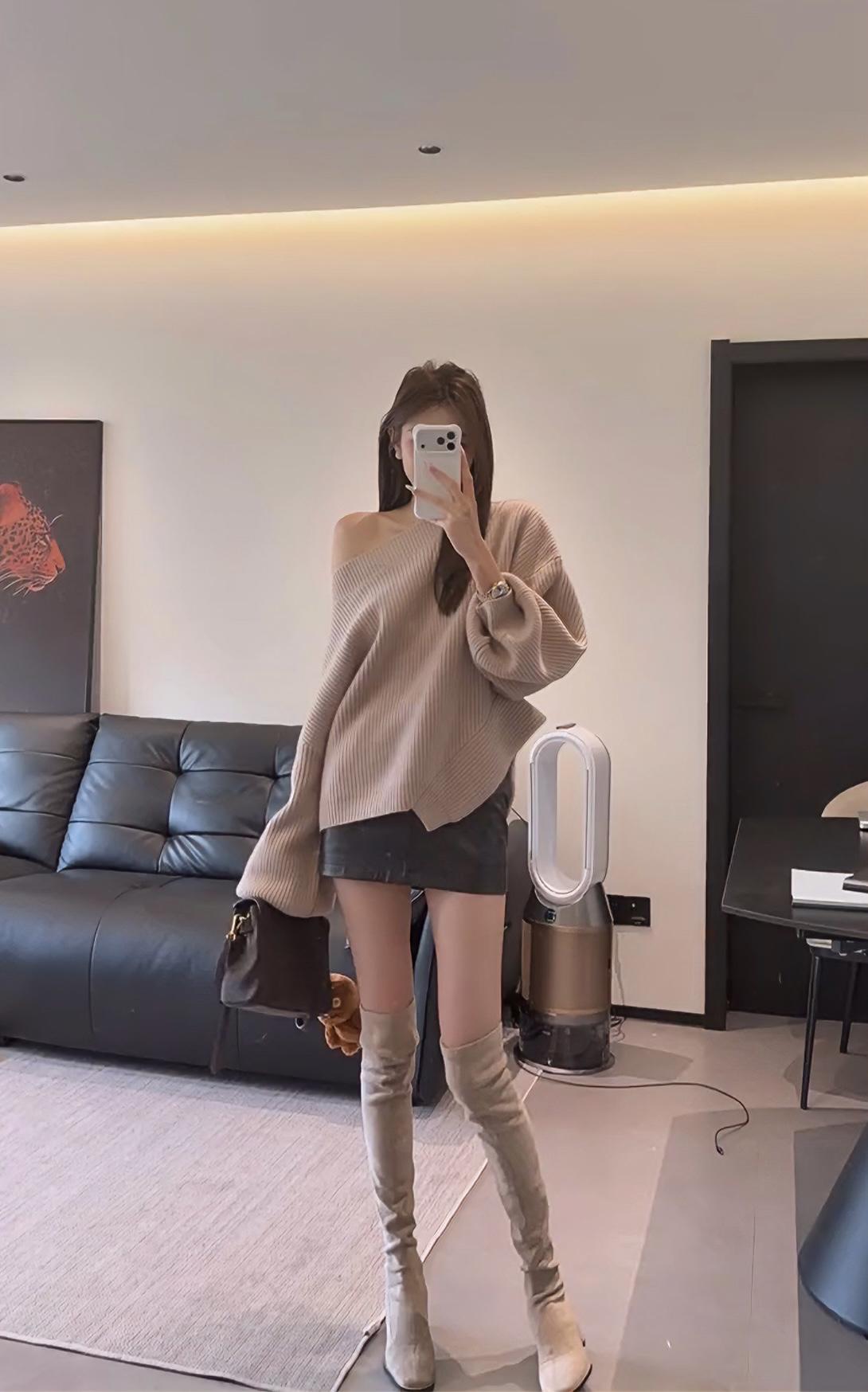 今日穿搭是温柔又带点小性感的轻熟风,整体色调柔和,层次分明: • 上衣:浅卡其色斜肩宽松针织衫,落肩设计露出一侧肩膀,慵懒又不失女人味,宽松版型对身材包容度高,还能营造“下衣失踪”的视觉效果。 • 下装:黑色超短皮裙,材质挺括,中和了针织衫的软塌感,同时拉长腿部线条,让比例更优越。 • 鞋履:同色系过膝长靴,绒面材质温柔又显腿长,和上衣颜色呼应,整体造型更协调。 • 配饰:深棕色腋下包+金色腕表,提升精致度,让休闲感中多了几分精致。 适合场合: 1. 日常出街/探店:宽松针织衫+长靴,走路舒适又出片,很适合和朋友逛街、打卡咖啡店。 2. 轻约会/下午茶:斜肩设计自带小性感,温柔又不刻意,能轻松拿捏约会氛围。 3. 闺蜜聚会/派对:搭配精致配饰,整体造型亮眼又不浮夸,适合需要拍照的社交场合。 4. 秋冬通勤(偏休闲):如果公司着装要求不严格,这套穿搭既保暖又有格调,能提升职场好感度。