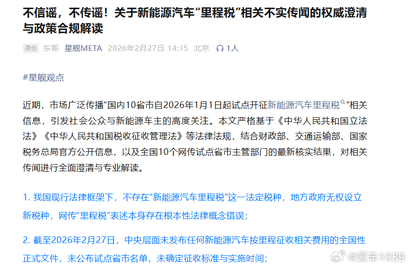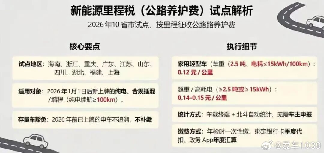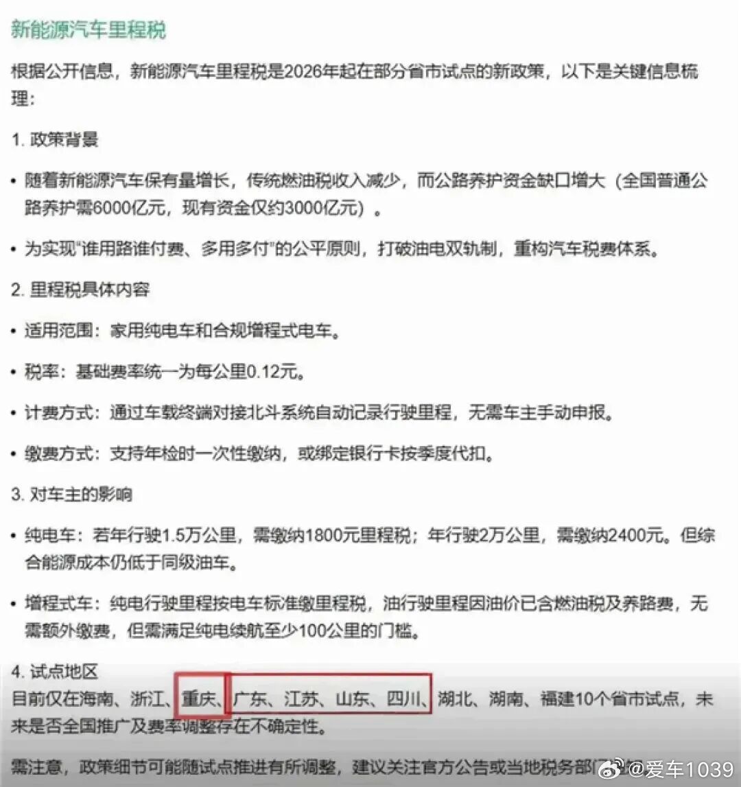 【爱车安全贴士 每公里0.12元,10省市试点征收新能源车“里程税”?多地税务部门回应】近期,“国内10省市自2026年1月1日起试点开征新能源汽车里程税”相关信息在社交平台发酵,传言明确列出试点地区、收费标准与代扣方式,引发车主与购车人群高度关注。真有这回事吗?网页链接