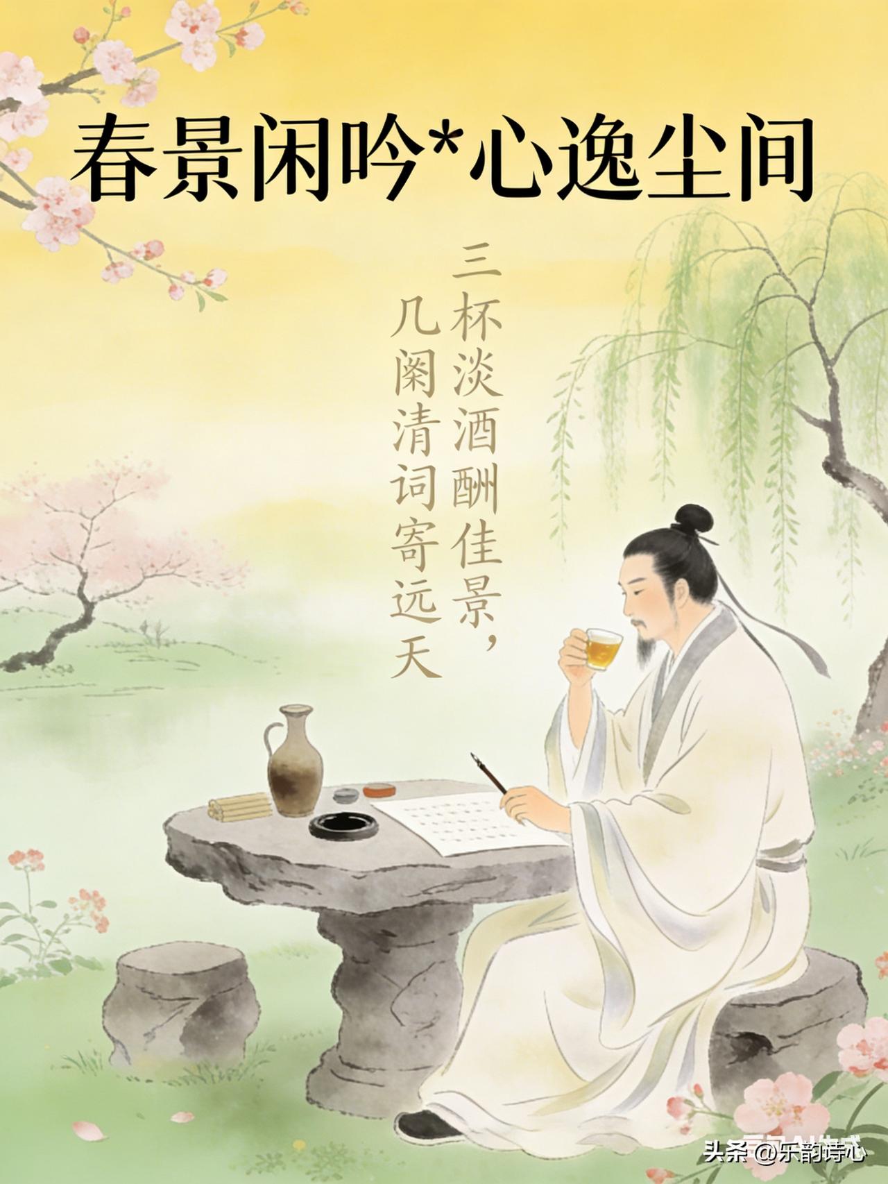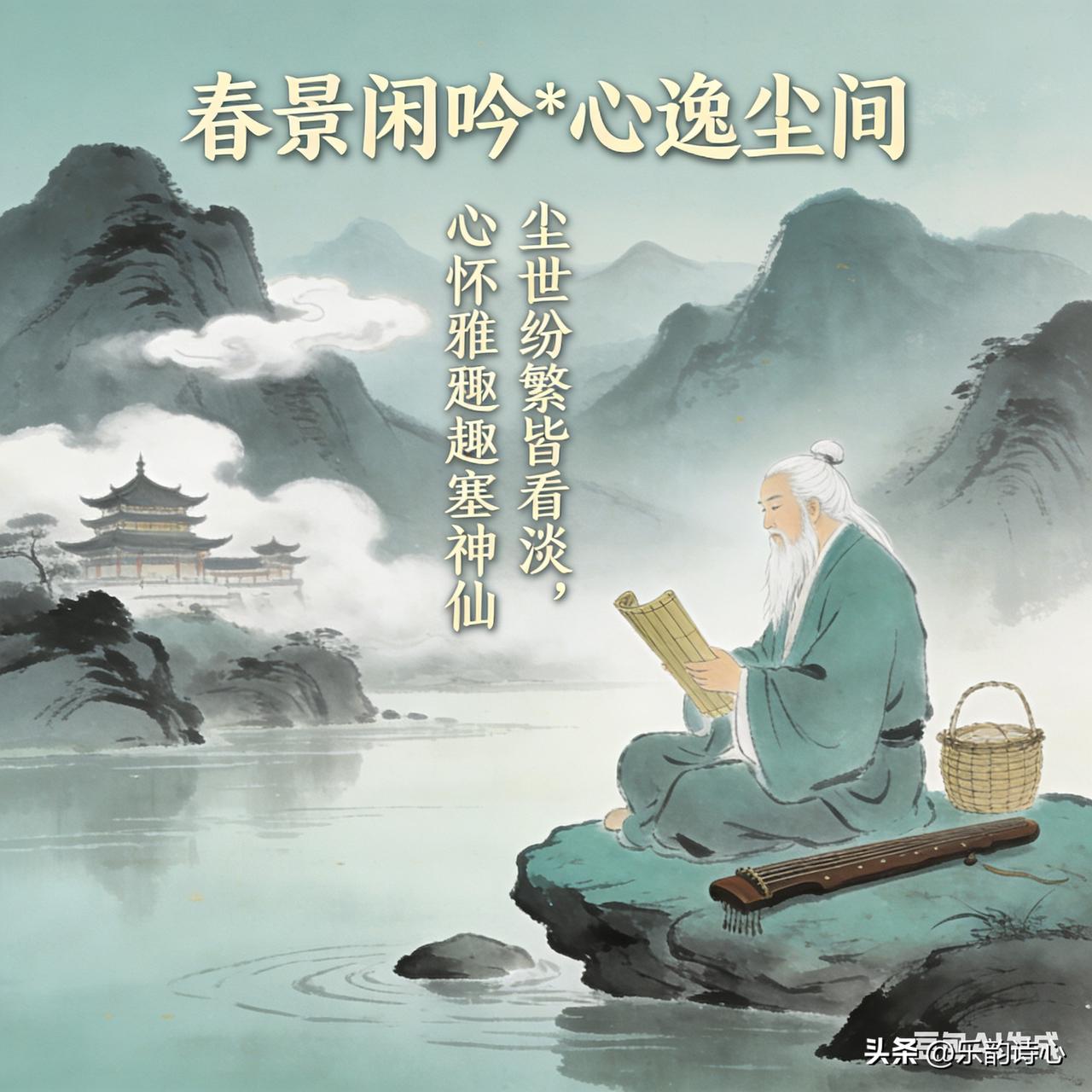 《春景闲吟*心逸尘间》乐韵诗心原创诗词: 春风轻抚画梁绵, 微雨飘阶梦亦甜。 峻岭披青雾隐现, 平湖漾碧月沉眠。 三杯淡酒酬佳景, 几阕清词寄远天。 尘世纷繁皆看淡, 心怀雅趣赛神仙。 这首诗词描绘春日美景,春风轻拂似画梁绵延温柔,微雨飘落台阶如梦般甜润。远处峻岭青葱,雾气隐现;近处平湖碧波,比神仙还要自在逍遥。