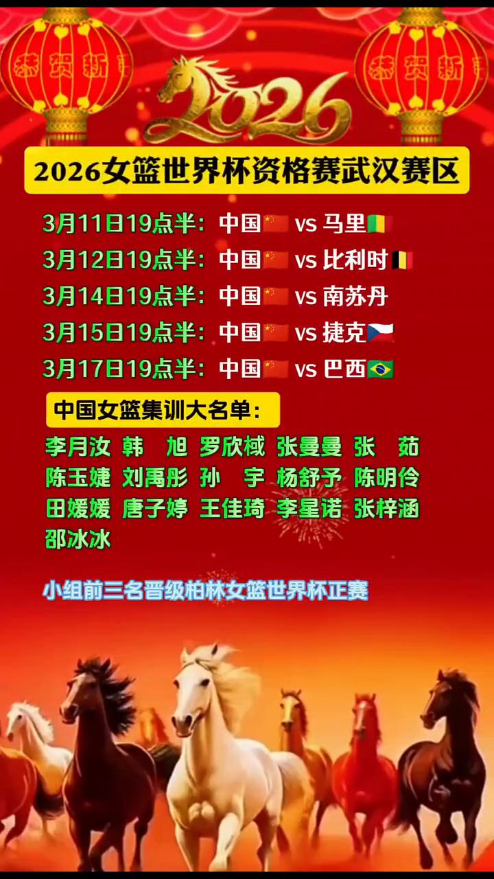 2026女篮世界杯资格赛武汉赛区。 ·3月11日19点半:中国vs马里。 ·3月12日19点半:中国vs比利时。 ·3月14日19点半:中国vs南苏丹。 ·3月15日19点半:中国vs比利时。 ·3月17日19点半:中国vs比利时。 中国女篮集训大名单:李月汝、韩旭、罗欣棫、张曼曼、张茹、陈玉婕、刘禹彤、孙宇、杨舒予、陈明伶、田媛媛、唐子婷、王佳琦、李星诺、张梓涵、邵冰冰。小组前三名晋级柏林女篮世界杯正赛。