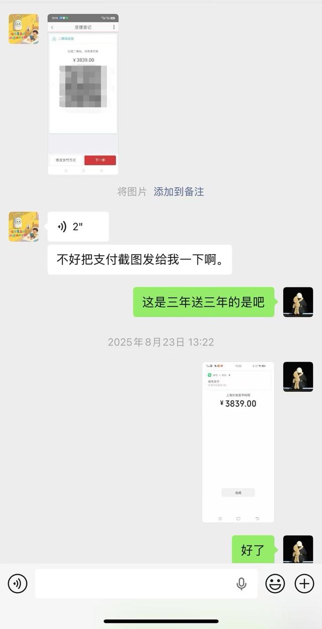 朱女士介绍,从2022年起,家中就在使用长城宽带。去年8月,因宽带服务到期,恰逢长城宽带又推出“满3年送3年”的优惠促销活动,她便支付3839元,锁定了一项长达6年的宽带套餐。“当时想着网络常年要用,此前宽带也没出过什么问题,就爽快付款了。”