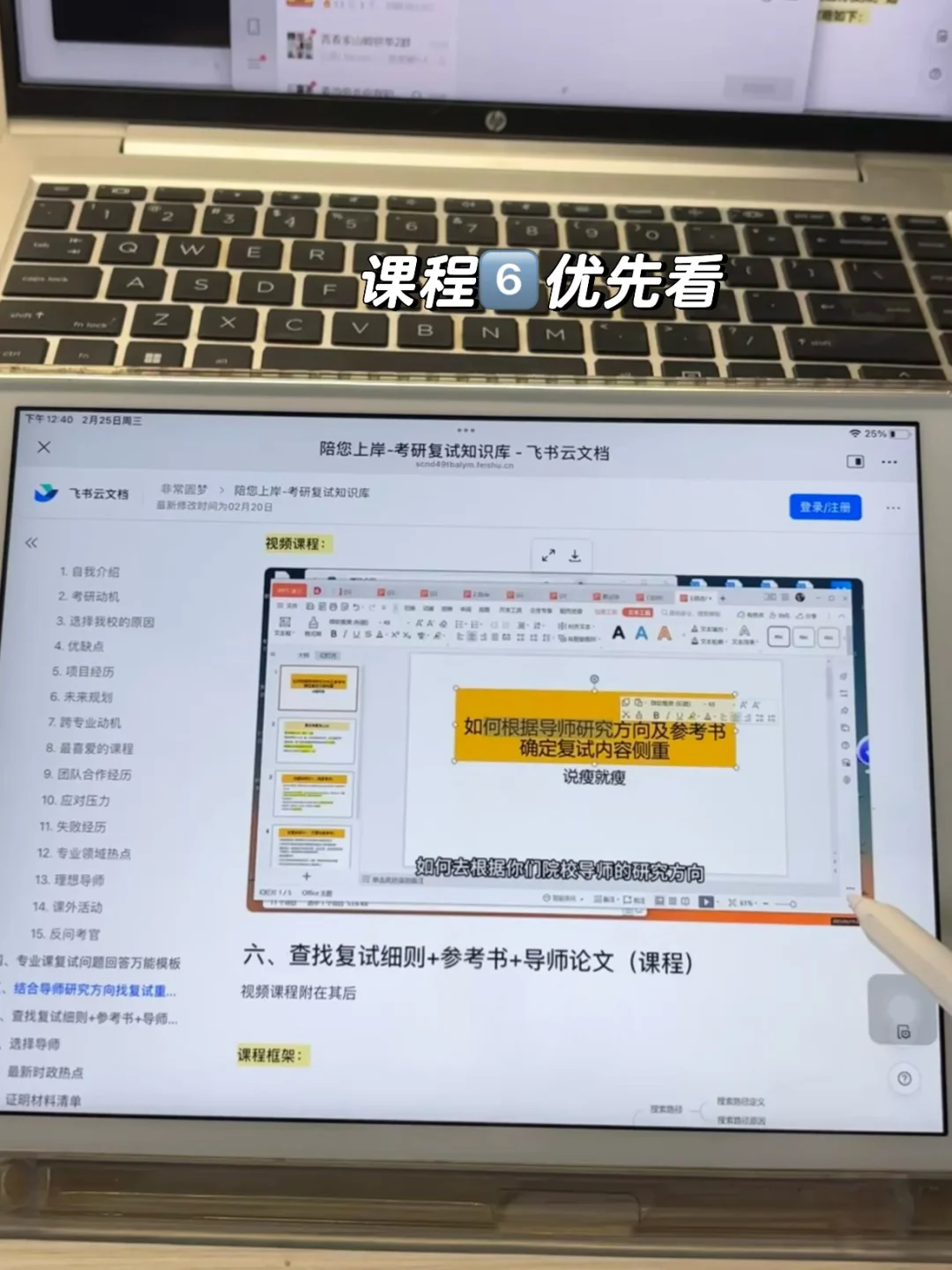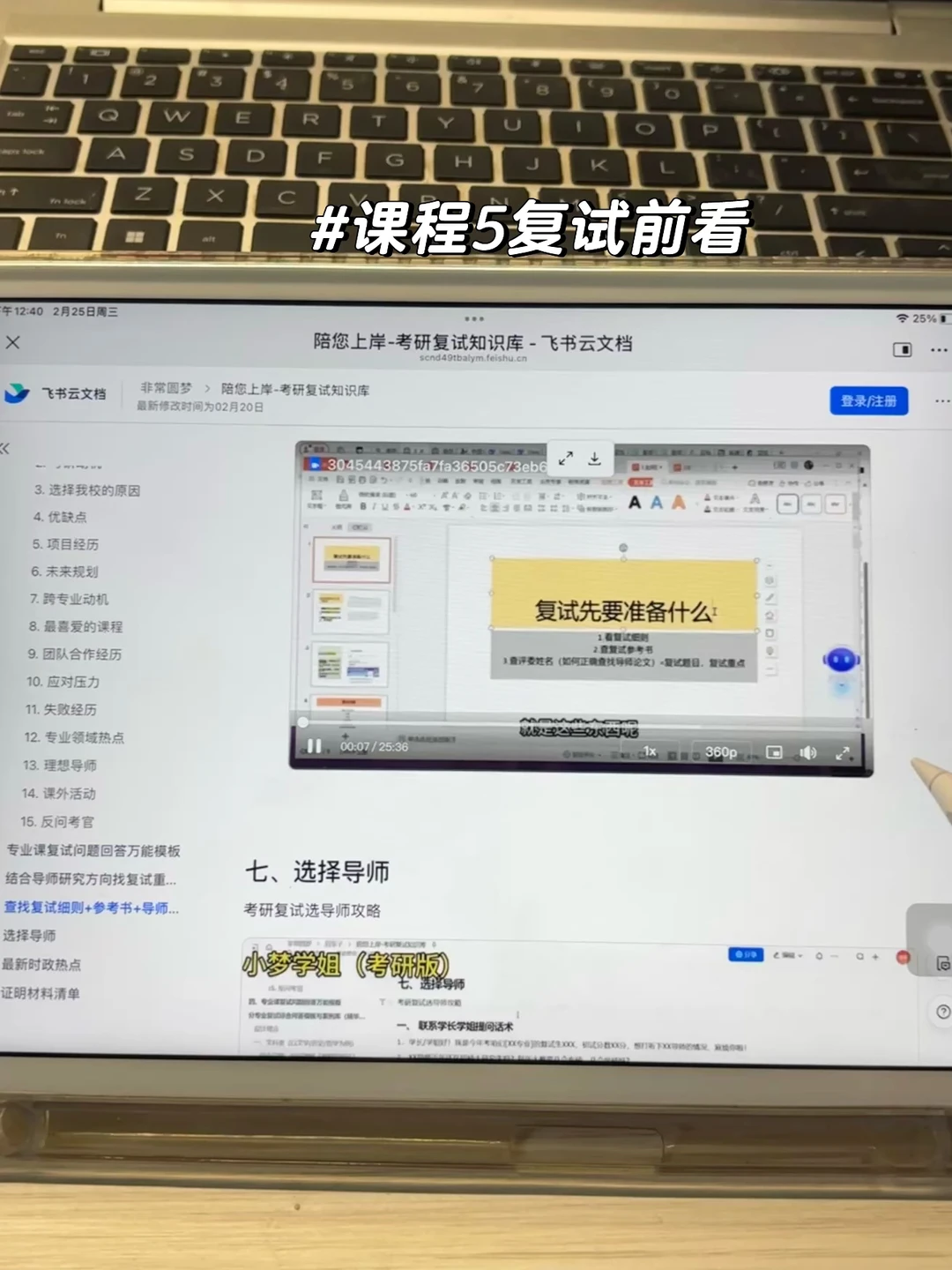 同样是资料包的课程 先看课程六,也就二十分钟,你把如何查找导师研究方向以及靠谱论文的方法学会,跟着课程 学一些怎么把导师论文方向揉成自己可以表达的语言,接着看课程五,讲的是如何结合导师研究方向倒推复试重点。
