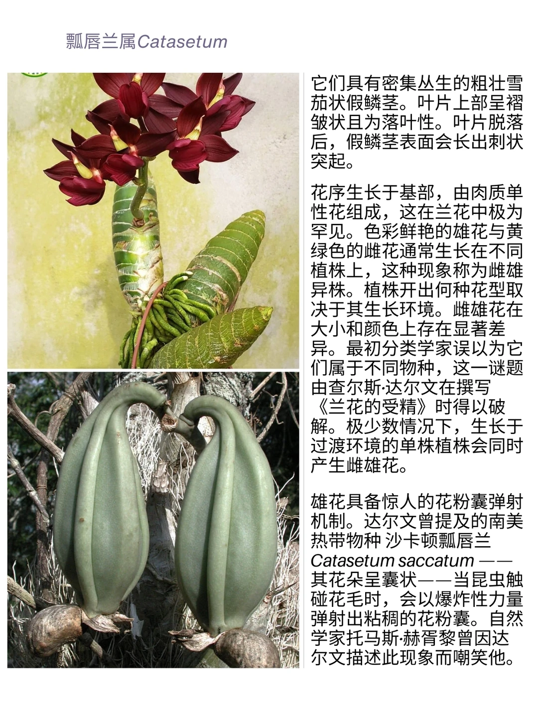雄花具备惊人的花粉囊弹射机制。达尔文曾提及的南美热带物种 沙卡顿瓢唇兰 Catasetum saccatum ——其花朵呈囊状——当昆虫触碰花毛时,会以爆炸性力量弹射出粘稠的花粉囊。自然学家托马斯·赫胥黎曾因达尔文描述此现象而嘲笑他。