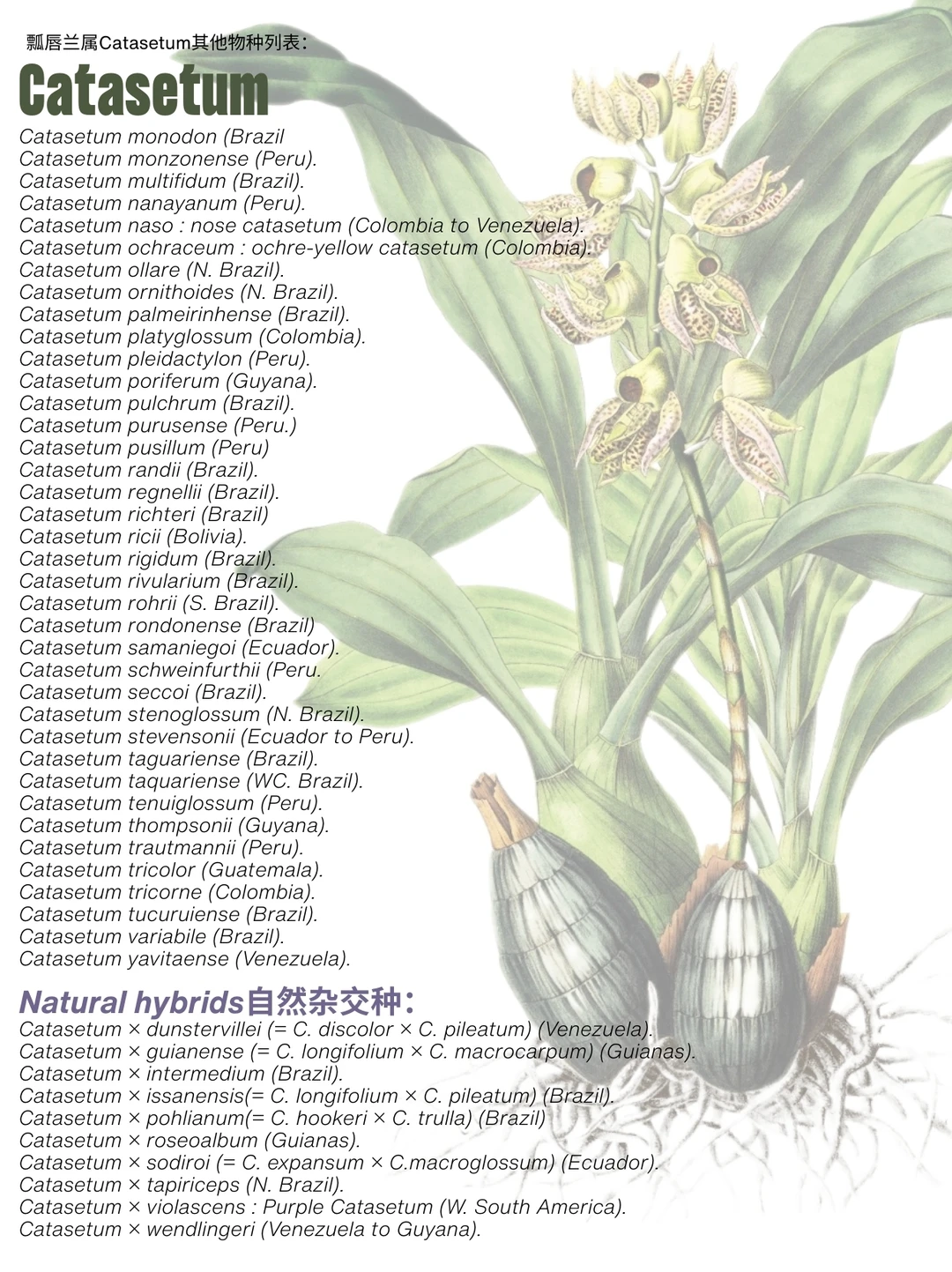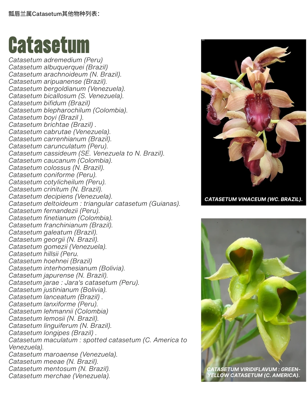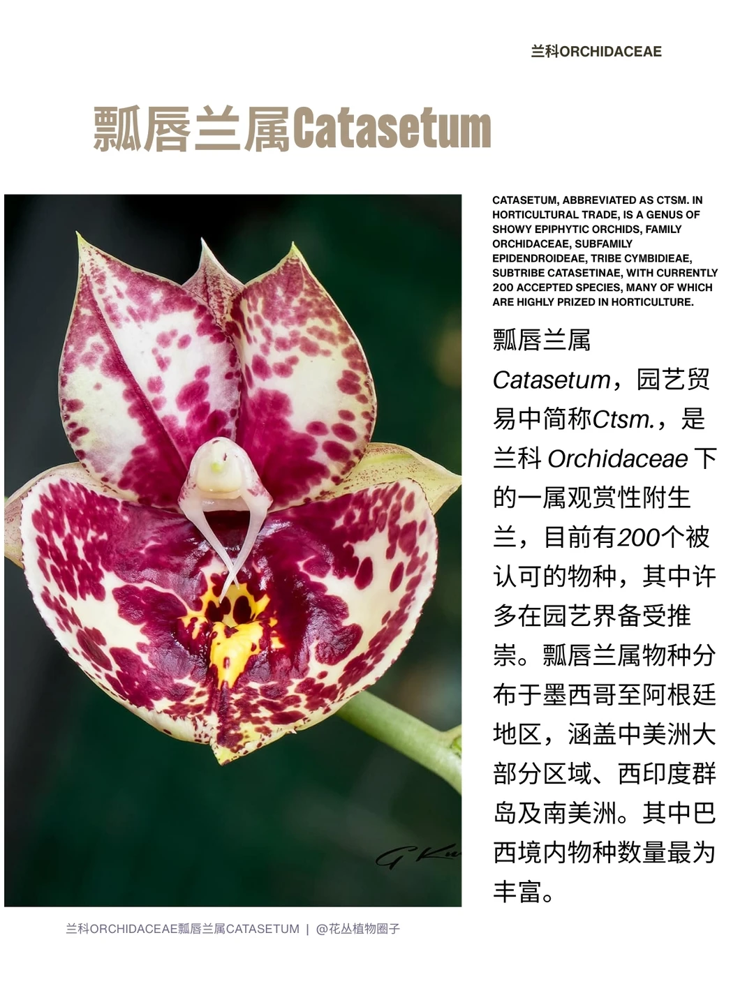 瓢唇兰属 Catasetum),园艺贸易中简称Ctsm.,是兰科 Orchidaceae 下的一属观赏性附生兰,目前有200个被认可的物种,其中许多在园艺界备受推崇。瓢唇兰属物种分布于墨西哥至阿根廷地区,涵盖中美洲大部分区域、西印度群岛及南美洲。其中巴西境内物种数量最为丰富。