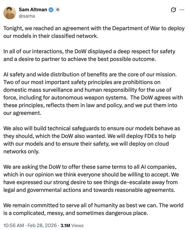 就在行业普遍对Anthropic表示支持之际,周五晚10点58分,OpenAI首席执行官萨姆·奥特曼(SamAltman)毫无征兆地在X平台宣布,他们已与国防部达成协议,将在其机密网络中部署OpenAI模型。
