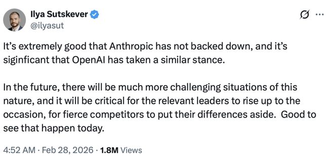 神隐已久的OpenAI联合创始人伊利亚·苏茨克维(IlyaSutskever)公开表示:“Anthropic坚守原则值得肯定,OpenAI也采取类似立场。”