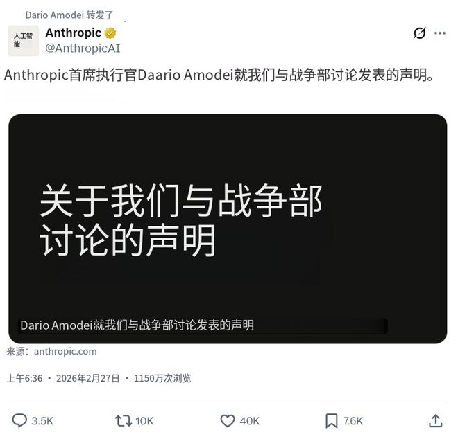 这一切的直接原因,是前一天晚上AnthropicCEO达里奥·阿莫代(DarioAmodei)发表的公开声明。他首先肯定了AI在保卫民主国家、应对专制威胁方面的战略价值,但随即指出,在大规模国内监控和全自主武器系统这两个领域,若不加限制,AI可能带来不可控的风险。