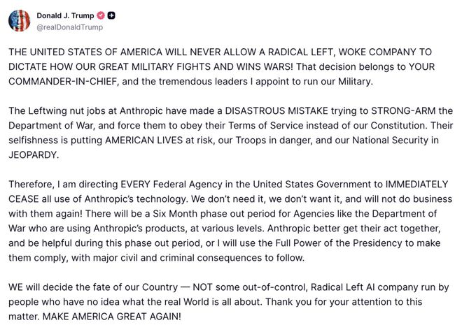 然而,就在27日下午4点,距离截止时间仅剩一小时。美国总统特朗普突然在自己的媒体TruthSocial上发布声明,痛斥Anthropic为“左翼激进分子”,并宣布所有联邦机构立即停用Anthropic技术,并给予六个月过渡期。随后,赫格塞斯在X平台正式宣布将Anthropic列为“国家安全的供应链风险”,指令所有美军承包商、供应商及合作伙伴不得与Anthropic开展任何商业活动。