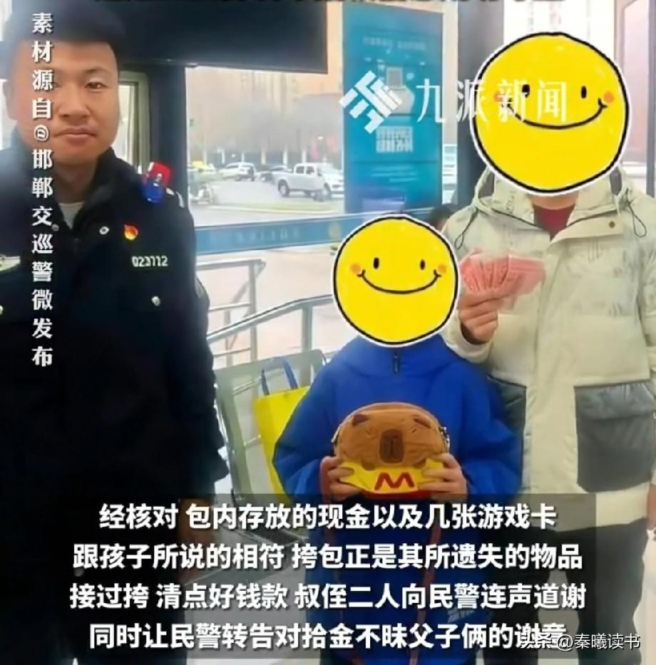 河北邯郸一小区广场上,一父子捡到一只小挎包,打开一看,里面竟有近800块。他们没有犹豫,立刻报警。谁知,民警却没马上收下,反而让孩子爸爸帮一个忙。 2月25日,河北邯郸一父子在小区广场散步时捡到一只小挎包,打开一看,里面竟装着近800元现金。父子俩没有丝毫犹豫,立刻拿出手机报警求助。 赶到现场的民警了解情况后,却没有立刻收下挎包,而是笑着对孩子爸爸说:“麻烦你帮个忙。” 孩子爸爸有些意外,原以为交完钱就结束了,连忙问能帮上什么。 民警解释道:“包是在小区里捡到的,失主大概率是业主。麻烦你在小区业主群里发个招领信息,让失主带有效证件来赵都新城警务站认领。” 孩子爸爸一听,当即爽快答应,立刻在群里发布了消息。 第二天上午,郭先生带着9岁侄子匆匆来到警务站,说在业主群看到信息,丢失的挎包和描述十分吻合。 原来,孩子前一晚在广场玩耍,嫌挎包碍事随手放在地上,回家时完全忘记。发现压岁钱丢了,孩子急得直哭,家人看到群消息后赶紧赶来。 民警仔细核对,包内的现金和几张游戏卡都与孩子描述一致,确认无误后将挎包归还。叔侄俩激动不已,连连向民警道谢,还特意嘱托民警,一定要帮忙转达对拾金不昧父子俩的感激之情。 拾金不昧暖人心,小事见人品。这对父子不贪钱财,民警用心帮忙,好人自有好报。小小压岁钱,传递大温暖,为善良点赞。 愿人人都能守住本心,传递正能量!