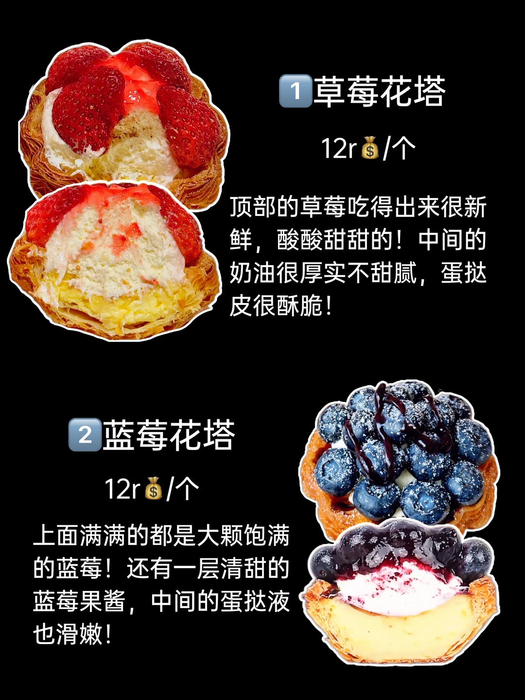 🙋甜品脑袋进!好利来最近出了好多新品,有些真的杀疯了!🔥本甜品脑袋刚上新就去吃了!吃到了4款夯品分享给你们!每一款都巨好吃[暗中观察R]喜欢的宝宝收藏哦~ 1️⃣草莓花塔 2️⃣蓝莓花塔 3️⃣芝士脆肠沙拉包 4️⃣焦糖奶油碧根果 💗无广纯分享!喜欢多多点赞,感谢支持!!