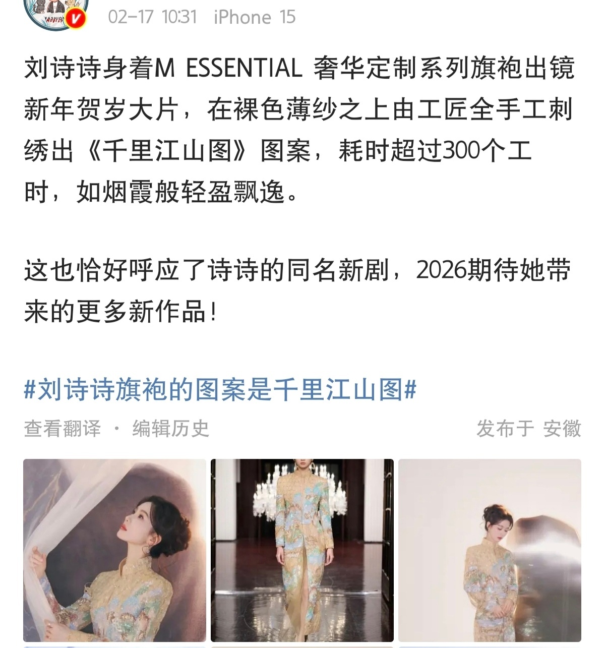 任何纸片人遇见刘诗诗都是幸运的因为她是最先为角色倾注所有情感的人,她可以把角色的内核完整呈现给观众。而且她在宣传方面也是贴近角色而做,新年的第一天就已经为剧做宣传,对自己角色用心的人只会火得更长久,很期待千里江山图的凌汶图为自修