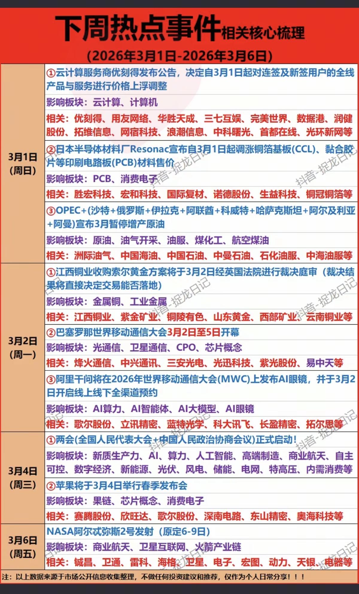 2.28周六 下周热点事件!核心梳理: 1.云计算、计算机 2.PCB+消费