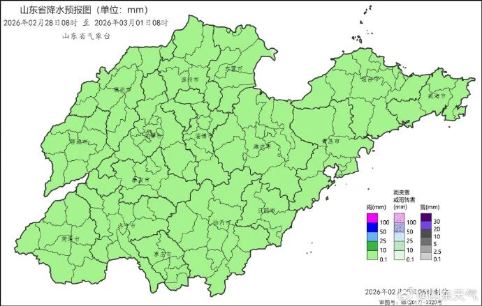 受气旋影响,预计28日下午到3月2日上午,山东自西向东将有一次较明显降水天气过程,全省累积平均降水量8~15毫米。其中,菏泽、济宁、泰安、枣庄、临沂、日照和青岛有中雨局部大雨(10~20毫米局部25毫米),聊城、济南、淄博、潍坊、烟台和威海有小到中雨转雨夹雪(5~15毫米),德州、滨州和东营有小雨转小雪(0~5毫米)。