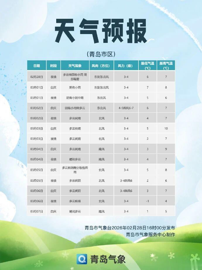 [青岛市区]今天夜间,多云转阴有小雨,局部有雾,东到东北风3到4级,明天白天,阴有小雨,东到东北风3到4级,相对湿度75%-95%,明天最低气温6℃,最高气温8℃。