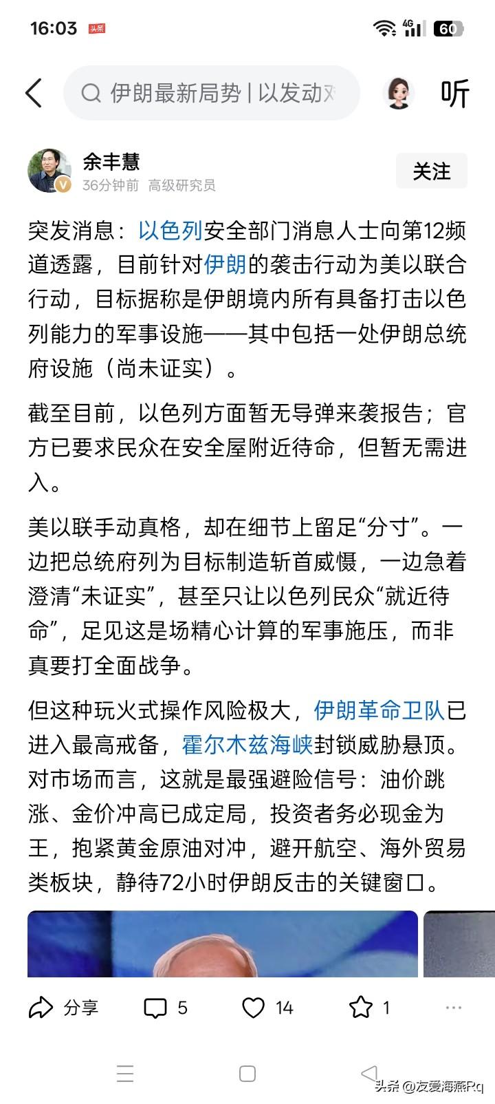 果然,美以联合对伊朗开始空袭! 以色列国防部长今天宣布的以色列空军对伊朗的攻击,据以色列安全机构的人员透露,是美国与以色列的联合军事行动的结果。 这一次对伊朗进行的空中袭击,估计是以美国总统特朗普的政府主导策划的军事行动,以色列好像就是个积极响应的角色,但以色列却心甘情愿做美国的马前卒,率先对伊朗进行空中打击。 虽然不清楚这一次对伊朗进行空中袭击会持续多长时间和具体的规模,但如果以色列为美国带头对伊朗进行空中打击,好像对伊朗大大的不利。因为,实际上以色列人对伊朗的不满或者说仇恨之深之大,可能是远远超过美国人。 虽然伊朗好像拥有众多威力强大的弹道导弹,但对以色列、或者美国进行实战的战斗机,却毫无任何打击作用,这好像是伊朗无法回避的致命弱点。