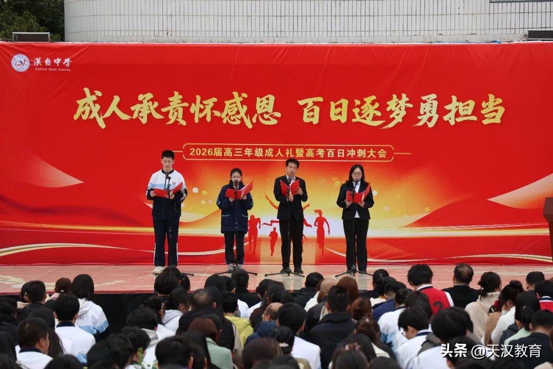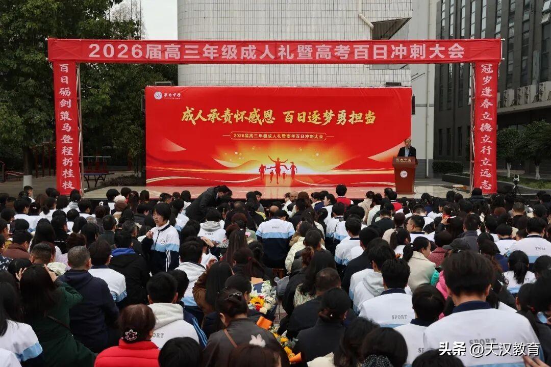 2月27日汉台中学2026届高三成人礼暨百日冲刺大会,在激昂雄壮的国歌声中盛大启幕!全体高三学子,以少年之赤诚、成年之担当,与校领导、恩师、家长,共赴这场镌刻成长、点燃梦想的青春盛典,吹响决胜高考、奔赴未来的冲锋号角! 十八岁承责,百日里冲锋!汉台中学2026届高三成人礼暨百日冲刺大会圆满落幕,这是少年时代的圆满句点,更是高考冲刺的冲锋号角!愿全体高三学子以成人之姿,怀感恩之心、勇担时代之责;以百日为战,以笔为剑、以勤为径,不负父母期盼、不负恩师栽培、不负青春韶华!百日磨剑,锋芒毕露;六月试锋,必创辉煌!2026,汉台学子,高考必胜!