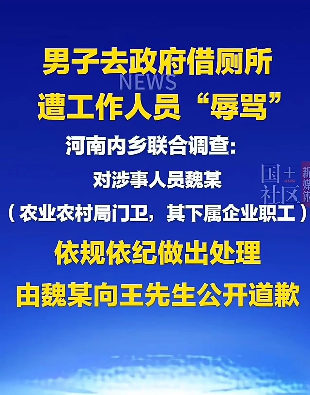 河南某地,一名男子因急需使用厕所,来到政府机关借用卫生间,却遭工作人员冷言相待。工作人员质问他:“你眼睛瞎了吗?看不懂指示牌?”男子对其态度不满,工作人员还讥讽道:“我还把你当神敬着呢?”网友纷纷表示,如果借个厕所都如此困难,老百姓遇到真正的难题又该怎么办? 2月14日早晨,市民王先生买菜回家途中突感肚痛难忍,急需找厕所。他看到附近农业农村局门口竖着一块写着“单位公厕,对外开放”的指示牌,心中一松,赶紧进门寻找。 进入院内后,一名穿制服的工作人员(后确认是门卫魏某)走出值班室。王先生忍着不适,礼貌询问厕所位置。没想到工作人员没抬眼,冷冷说:“你看不见指示牌吗?” 王先生坦言自己没带眼镜,视线模糊,请对方指点具体楼层。工作人员却指着他鼻子大声斥责:“你不会看吗?还要我教?” 王先生尴尬又无奈,只能自行摸索,终于在楼梯附近找到卫生间。事毕,他怒气渐生,想找工作人员理论,却被对方关上电动门,态度傲慢。 王先生用手机录像留证,工作人员才勉强重新开门,并嚷嚷着要见领导,却无人出面调解。魏某还讥讽道:“我还把你当神敬着呢,你闲着没事干是吧?” 此言如同耳光,击碎了“为人民服务”的美好形象。愤怒的王先生将视频上传网络,引起广泛关注。 当地政府迅速核实属实,涉事工作人员魏某被责令公开道歉并接受纪律处分。内乡县农业农村局也启动专项整顿,誓言改善服务态度,杜绝类似“门好进,脸难看”的现象。 网友评论热烈,有人支持王先生,斥责工作人员傲慢无礼;有人认为沟通双方都有责任;也有人感叹如今机关服务与老百姓的距离越来越大。 大家普遍认为,政府部门不仅要挂出“对外开放”的牌子,更要有真心实意的服务。王先生因高度近视未带眼镜,本应得到理解和帮助,却遭遇冷漠,令人失望。 “我还把你当神敬着”的说法,暴露出工作人员把服务当施舍的错误心态。纳税人是主人,工作人员应当尊重和服务群众,而非将他们当作麻烦。 希望此次事件能成为警醒,促使机关单位真正做到敞开大门,也敞开心扉,切实为民办实事。公厕现象 公厕厕所 厕所公厕