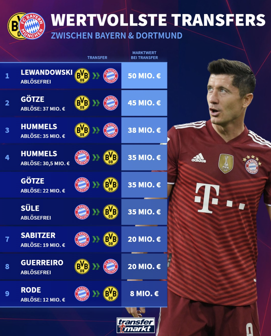 莱万当年从多特免签至拜仁时身价5000万欧居首,格策和胡梅尔斯分别在转会拜仁时以4500万和3800万欧的身价排名二三。