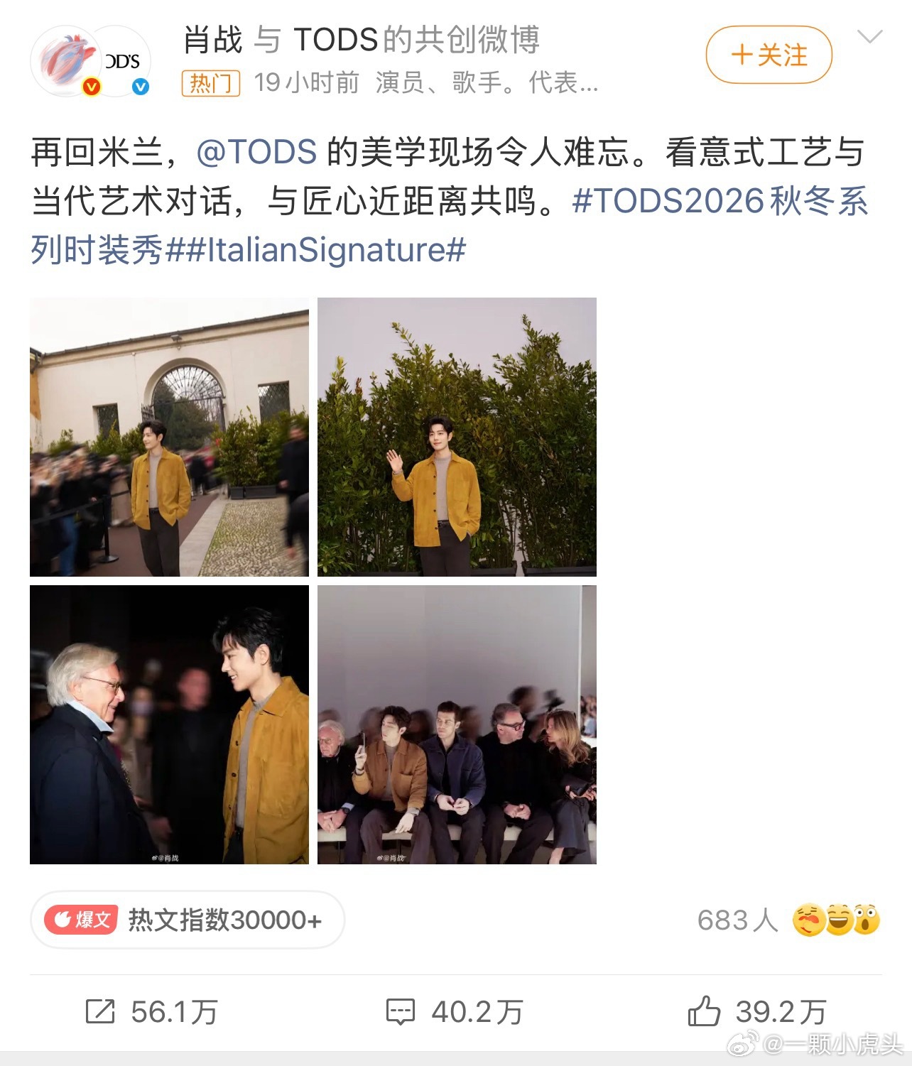 肖战发的和tods共创的博文要尽快双百[赞]肖战在tods的秀场,跟回老家与朋