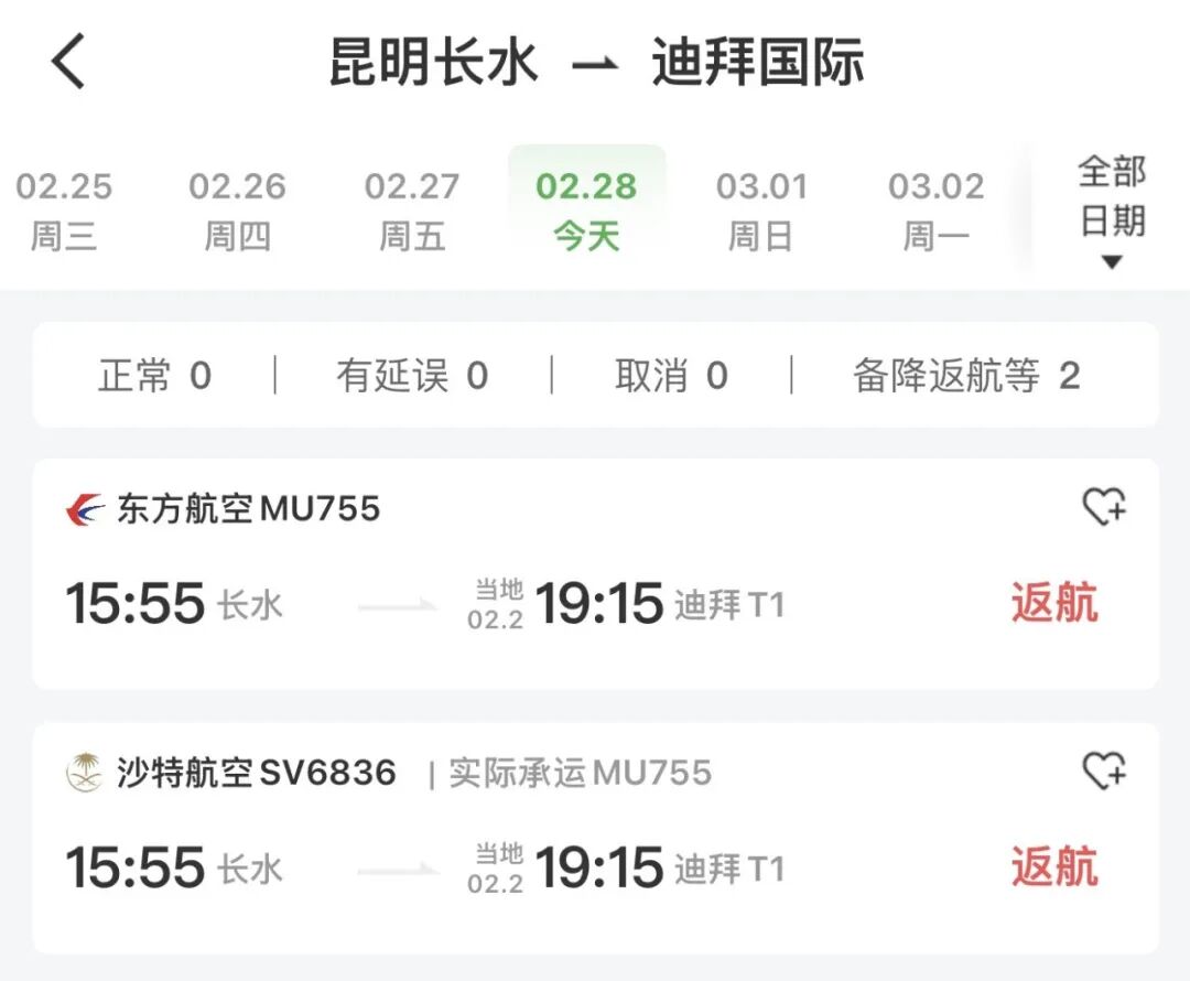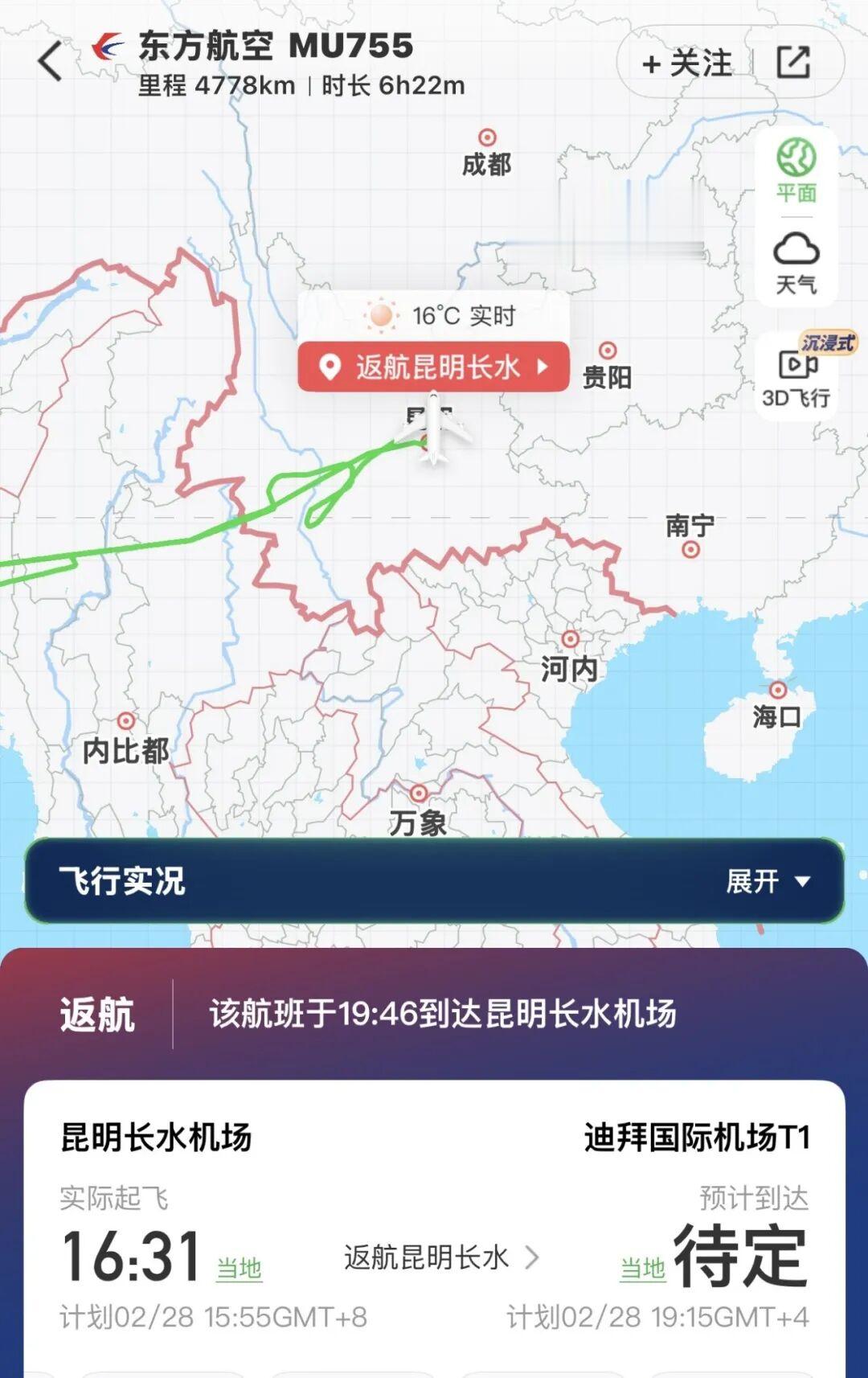 第二个是2月28日昆明飞迪拜的MU755航班,也已经返航到昆明机场。