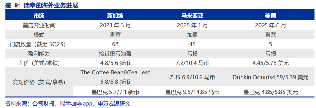 除了在国内加速布局外,瑞幸咖啡也在开拓海外市场。财报显示,2025年,公司在新加坡、马来西亚、美国分别新开设了30家、70家和9家门店。其中,最早布局的新加坡业务已经接近扭亏为盈。