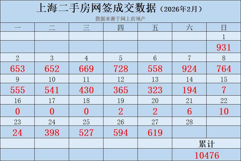 上海2月二手房成交(统计截至2/27):2/27签约成交619套,2月二手房累计签约成交10476套(数据源自网上房地产);