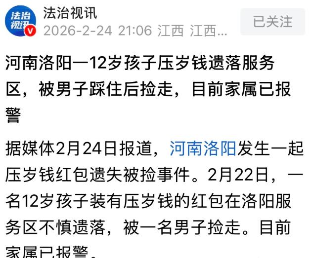 河南,12岁孩子不小心把装有1255元压岁钱的红包掉在服务区,一男车主看到后,立马用脚踩住红包,确认没人注意他后,迅速弯腰捡起红包,若无其事开车走人,家长事后看到监控气得直接报警了。 大年初六,春节假期正热闹,大家都在忙着往回赶,河南洛阳的一个高速服务区里,人来车往,乱糟糟的,就在这,发生了一件让人既生气又心寒的事。 有个才12岁的小男孩,不小心把装了1255块钱压岁钱的大红包给掉地上了,这红包啊,可是孩子整个春节辛辛苦苦攒下来的,是长辈们的心意和祝福,对孩子来说那就是个宝。 那天孩子跟着家里人自驾回家,路过服务区停车歇脚,顺便上个厕所,下车的时候孩子动作有点急,那个装着钱的红袋子就这么从口袋里滑了出来,掉在了车位旁边,当时孩子和家里人都没察觉到。 这一幕,偏偏被旁边一辆黑色轿车上下来的男的给看见了,这男的走到红包跟前,他没立刻弯腰捡起来,也没喊一声问问是谁丢的。 反倒是先鬼鬼祟祟地四处瞅了瞅,看看周围有没有人注意他,确认没人盯着这边后,他不动声色地伸出一只脚,把那个红包给踩住了,还假装不经意地挪了挪脚,把它遮得严严实实的。 等觉得彻底没人发现了,这男的才像闪电一样弯下腰,一把抓起红包揣进兜里,整个过程那叫一个熟练,脸上一点表情都没有,然后他就跟没事儿人一样,径直走回自己的车上,发动车子一溜烟开走了,连头都没回。 孩子从厕所出来以后,一摸口袋空空如也,当时就慌了神,这1255块钱虽然在大眼里不算多,但在孩子心里那是全部家当啊。 孩子急得原地转圈圈,眼泪止不住地往下掉,家里人一看这情况,赶紧帮忙找,把服务区的地面、车位、厕所全都翻了个遍,就是没看见红包的影子。 实在没招了,孩子妈妈聂女士突然想起来,车上装了行车记录仪,镜头正好对着那个车位,说不定能拍下来咋回事,她赶紧回车里调取视频,这一看不要紧,全家人那是又气又心疼。 监控视频把那个男的怎么踩住红包、怎么观察周围、怎么捡钱走人的全过程拍得清清楚楚,甚至连他开的那辆挂着陕E牌照的黑色轿车,还有他穿的衣服、长啥样都一目了然。 这哪里是捡钱啊,分明就是明目张胆地贪小便宜,故意把孩子的钱据为己有。 聂女士越想越气,这不仅仅是钱的事,这是性质太恶劣了,她把所有的视频证据都保存好,第一时间报了警,把情况跟警察说得明明白白,还提供了车牌号和监控录像,就指望警察能把这人找出来,帮孩子把钱要回来。 警察接到报警后也很重视,立刻根据车牌信息展开了调查,联系上了那个车主,可让人没想到的是,这车主一开始居然还不承认,说不认识捡钱的人,这事跟他没关系。 后来警察也没惯着他,结合服务区的公共监控和聂女士提供的行车记录仪视频,把证据链给固定死了,还在持续跟进处理这事。 这事被发到网上后,网友们也都炸了锅,大家都指责这个男的行为太过分了,捡到东西归还失主那是做人的基本道德,更何况这是个孩子的压岁钱,为了这点钱,用脚踩住偷偷拿走,真是既没素质又没底线。 有律师也说了,根据民法典的规定,捡到遗失物必须还给失主,如果拒不归还那就属于不当得利,失主是有权要求返还的。 虽然这1255块钱还没达到刑事立案的标准,但如果警察责令退还后他还赖着不给,那是可以依法给他治安处罚的,这男的刻意遮挡、偷偷捡走的行为,属于主观故意侵占,不仅违背了公序良俗,也是触犯了法律规定的。 现在这个案子还在进一步调查处理中,家长也没想把事情做绝,就希望对方能主动把红包还回来,承认个错误,给孩子一个公道。 这件事也给咱们大家都提了个醒:出门在外一定要看好自己的财物,特别是现金、手机这些贵重物品。 同时也说明了一个道理:贪小便宜早晚是要吃大亏的。现在的监控到处都是,你一时贪心可能换来的就是名声扫地、还要承担法律责任。 拾金不昧不只是个美德,更是咱们做人的底线,千万别因为一点小钱,把人品和尊严都给丢光了。 对此你怎么看? 信源:中安在线
