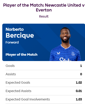 攻入一球,贝托当选埃弗顿vs纽卡球迷票选全场最佳