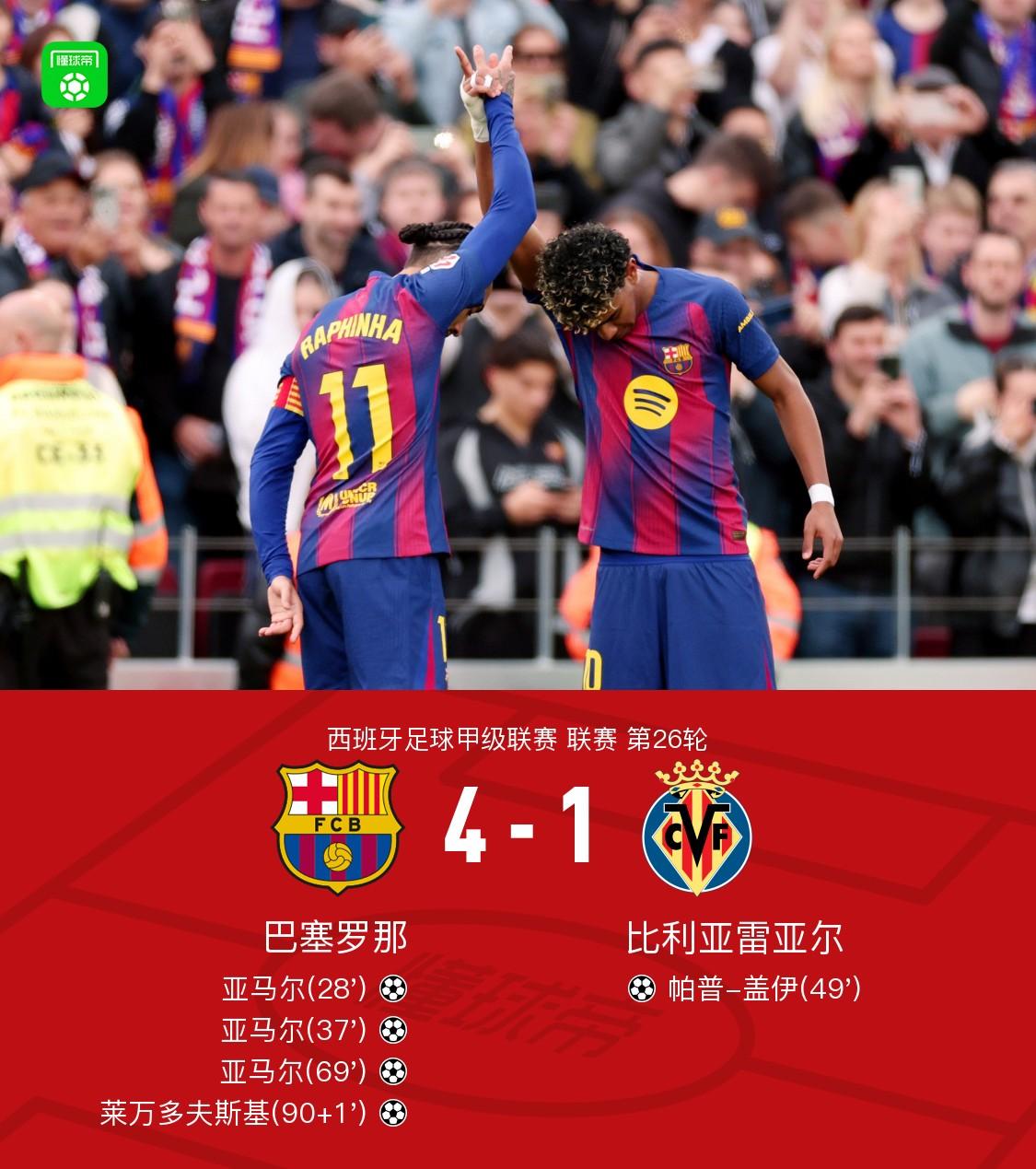 这轮比赛太爽了,各个队进这么多球。 你看有你的主队没有? 小蜜蜂队也好耍,先进3球,居然又被连进3球,最后还好4:3胜。 该队球员伊戈尔已打进18球了。 .巴萨4-1黄潜,亚马尔生涯首次戴帽,莱万替补建功。英超联赛