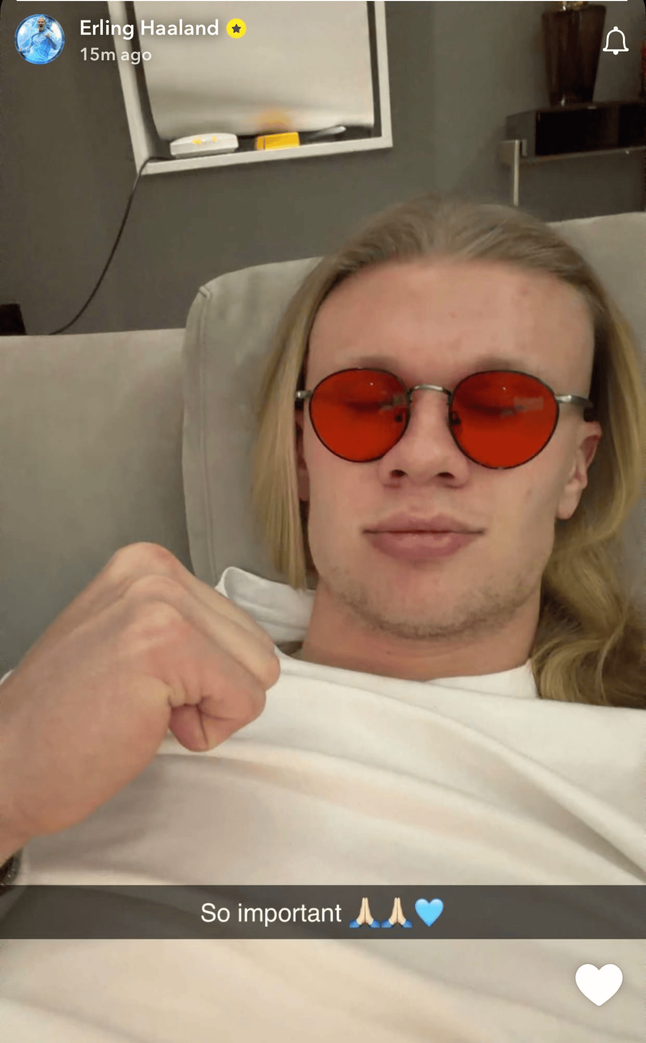 本场伤缺的哈兰德赛后在Snapchat上晒出自拍并附文:“太重要了”