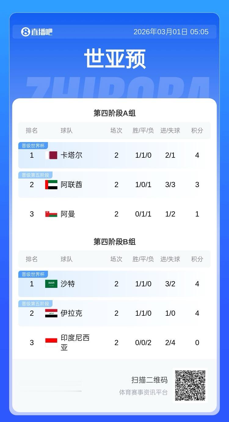 世预赛亚洲区4阶段积分榜: