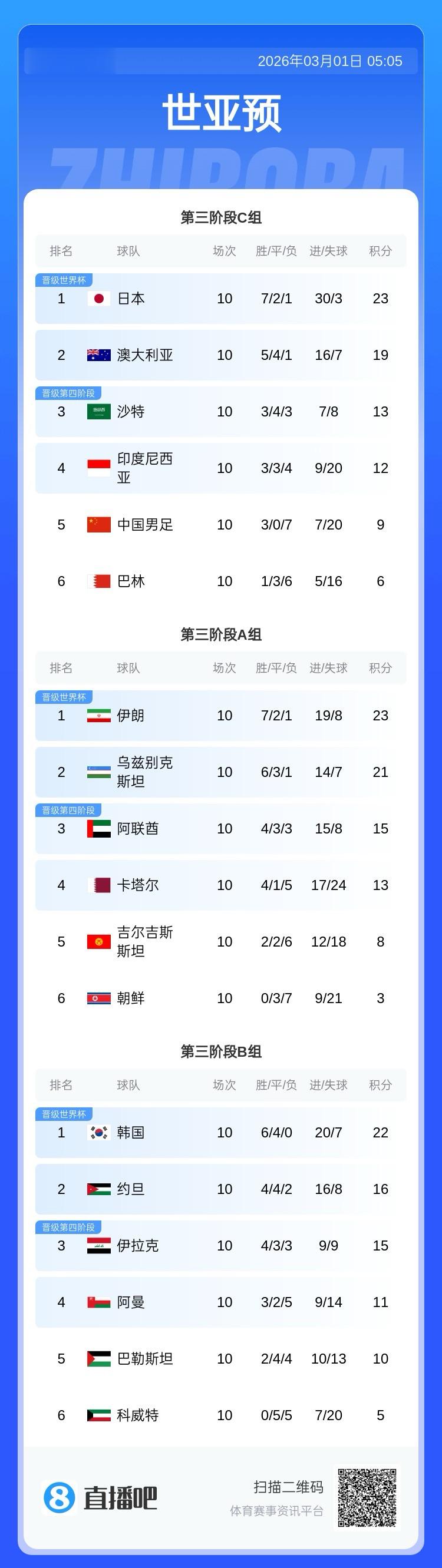 世预赛亚洲区3阶段积分榜: