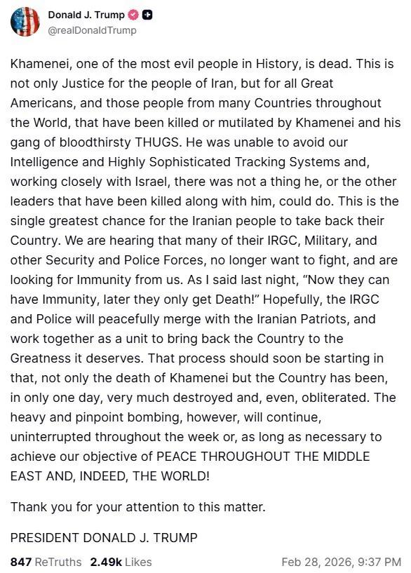 美国联邦政府总统唐纳德·J·特朗普在社交媒体上发布消息确认哈梅内伊死亡。 以下是他的社交媒体贴文: “ 哈梅内伊,死了。这不仅是伊朗人民的正义,也是所有伟大的美国人以及世界上许多国家那些被哈梅内伊及其嗜血暴徒团伙杀害或残害之人的正义。 他无法躲避我们的情报和高度精密的追踪系统,并且在与以色列紧密合作下,他以及与他一同被击毙的其他领导人毫无办法。这是伊朗人民夺回他们国家的绝佳机会。 我们听说他们的许多伊斯兰革命卫队、军队以及其他安全和警察部队不再想战斗,并且在寻求我们给予豁免权。 正如我昨晚所说:“现在他们能获得豁免权,之后他们只能得到死亡!”希望伊斯兰革命卫队和警察能与伊朗爱国者和平融合,共同努力让国家恢复应有的伟大。 这个进程应该很快就会开始,因为不仅哈梅内伊死了,而且这个国家在仅仅一天之内就被严重摧毁甚至 彻底毁灭。然而,重型精确轰炸将持续不间断地进行一整周,或者只要达成我们在中东乃至全世界实现和平这一目标所需的时间那么长! 感谢你关注此事。 ”
