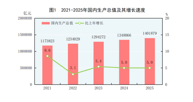 初步核算,2025年,我国国内生产总值(GDP)1401879亿元,比上年增长5.0%,经济总量首次突破140万亿元大关。详情(