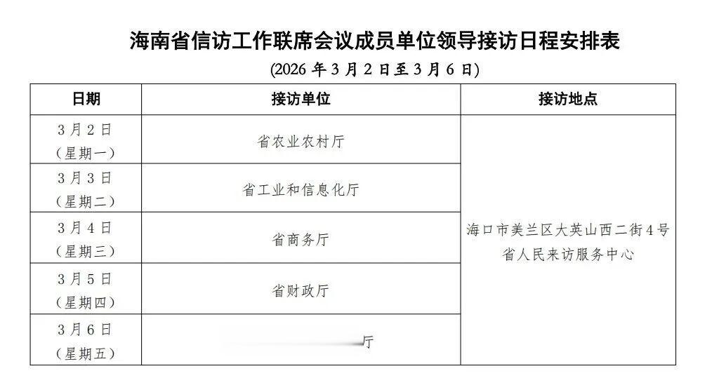 3月2日至6日海南省直属单位领导接访日程公布,具体日程安排如下表↓详情(