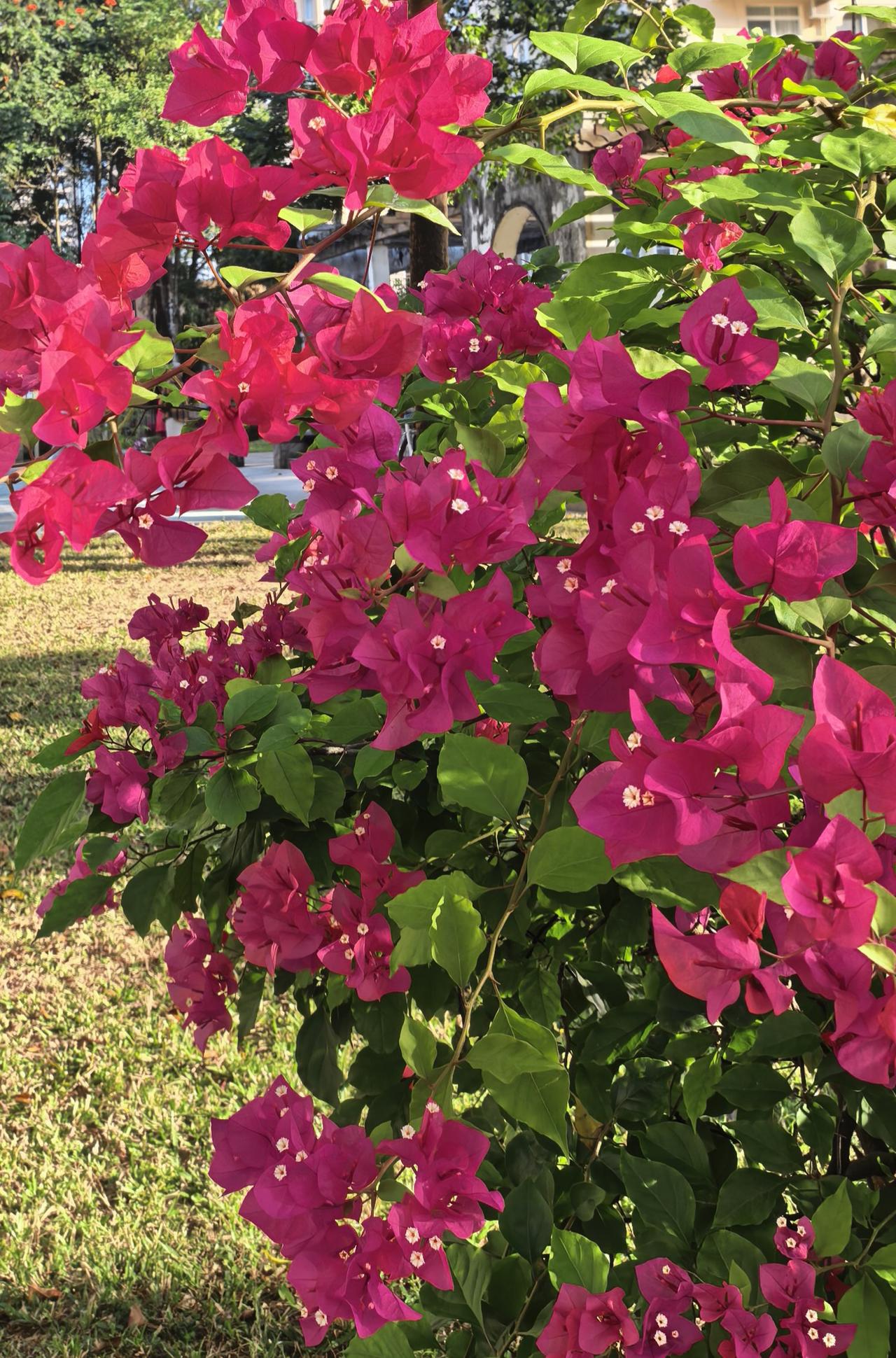 你见过三角梅开花吗? 三角梅,火焰般的红色 那是藤蔓叶片儿的红色 三角梅的花 一朵小白花 隐身于红叶之中