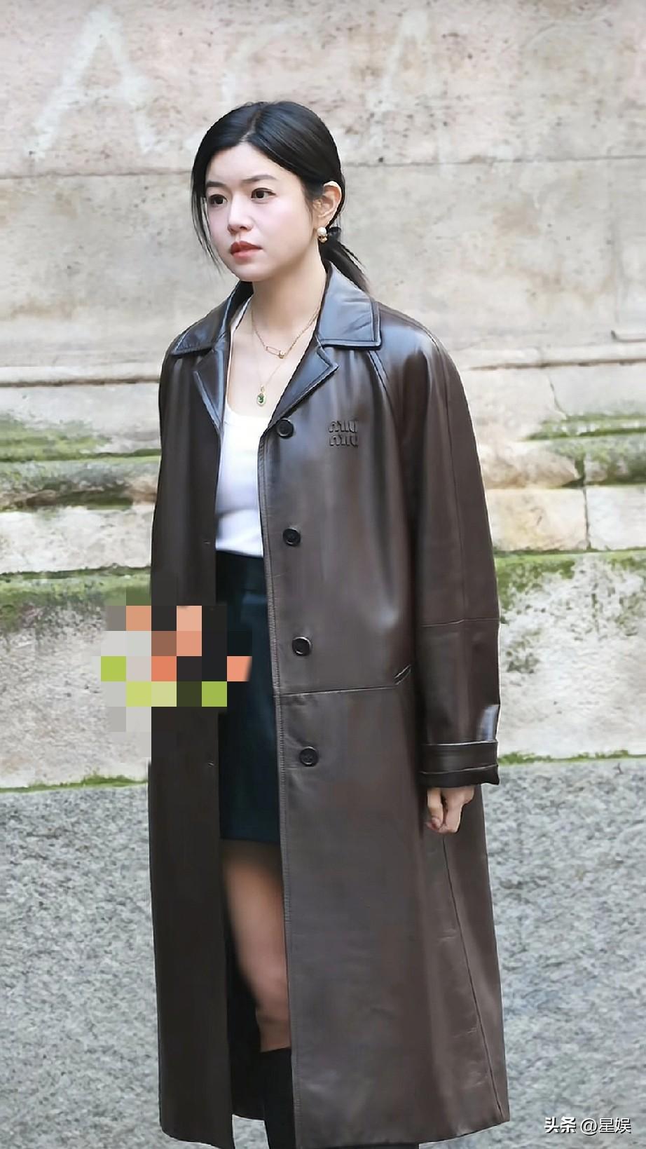 陈妍希棕色皮衣搭配黑色短裙