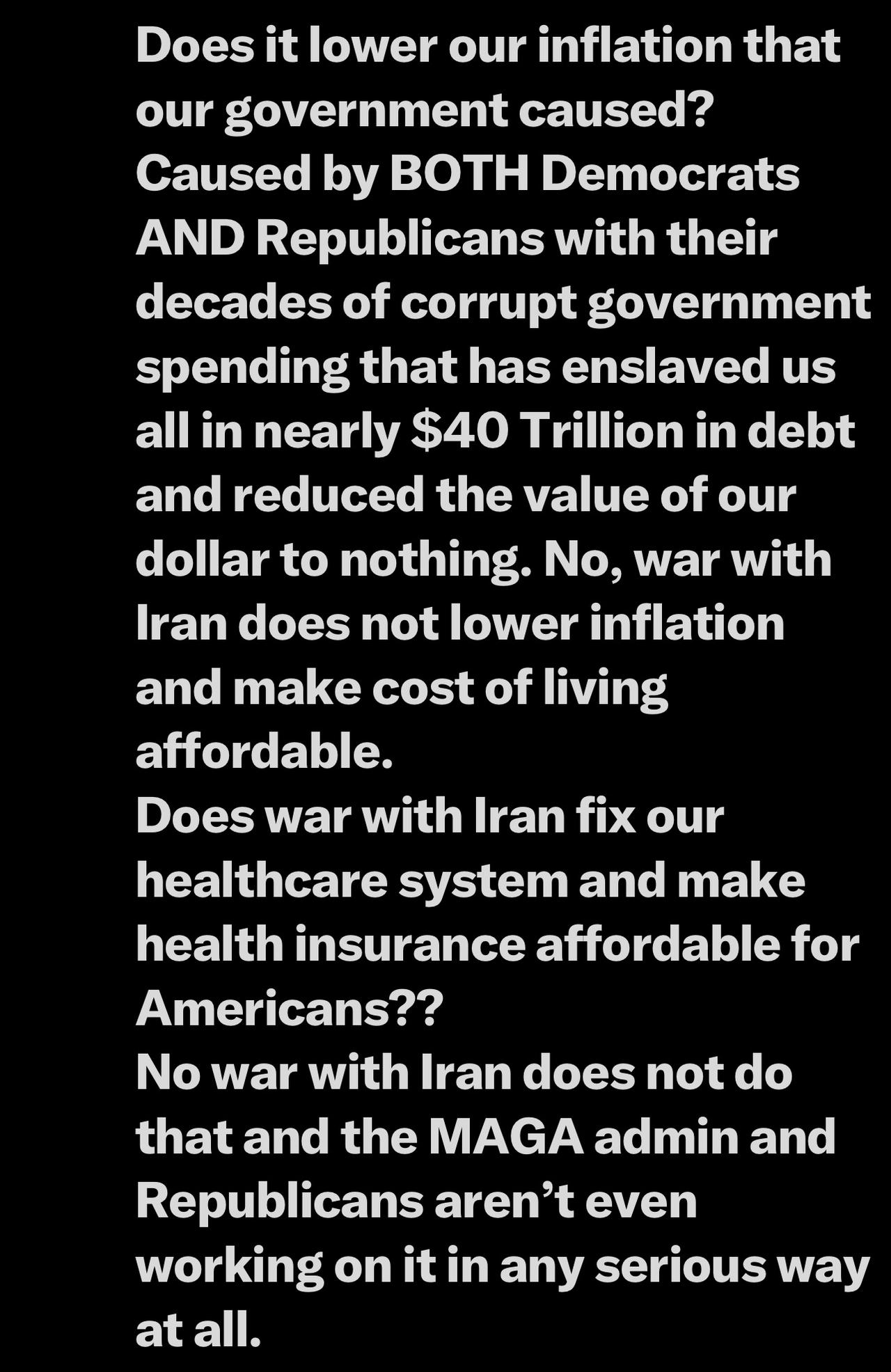 发动与伊朗的战争能降低我们政府造成的通货膨胀吗?这通货膨胀是由民主党和共和党共同造成的,他们数十年来腐败的政府支出使我们背负了近40万亿美元的债务,并将美元贬值到几乎为零。不,与伊朗开战并不能降低通货膨胀,也不能降低生活成本。