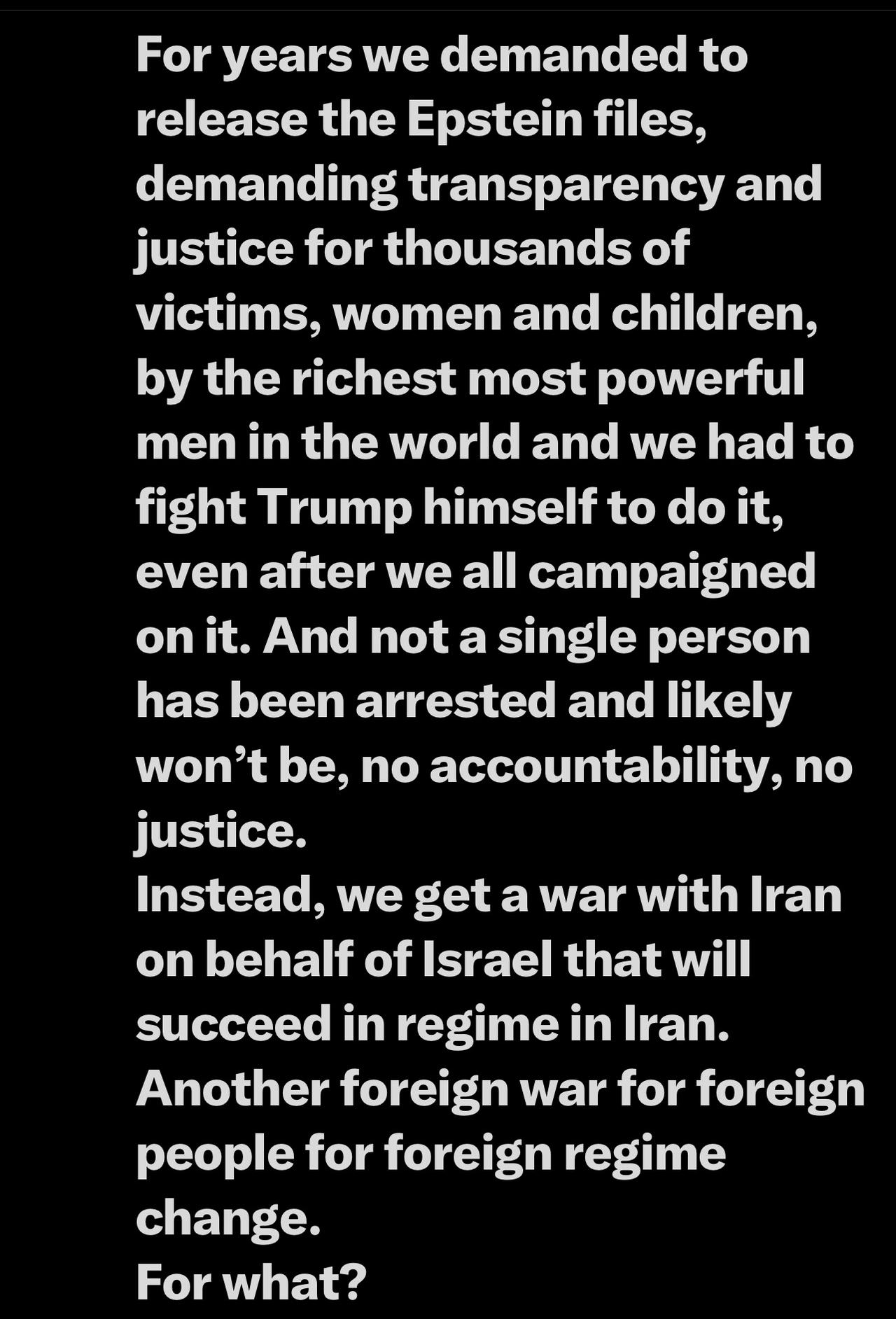 多年来,我们一直要求公开爱泼斯坦的档案,要求世界上最富有、最有权势的人为成千上万的受害者——妇女和儿童——伸张正义,并要求真相大白。即便我们所有人都在竞选时承诺过这一点,我们仍然不得不与特朗普本人抗争才能实现这一目标。然而,至今没有一个人被逮捕,而且很可能也不会有人被逮捕,没有问责,没有正义。