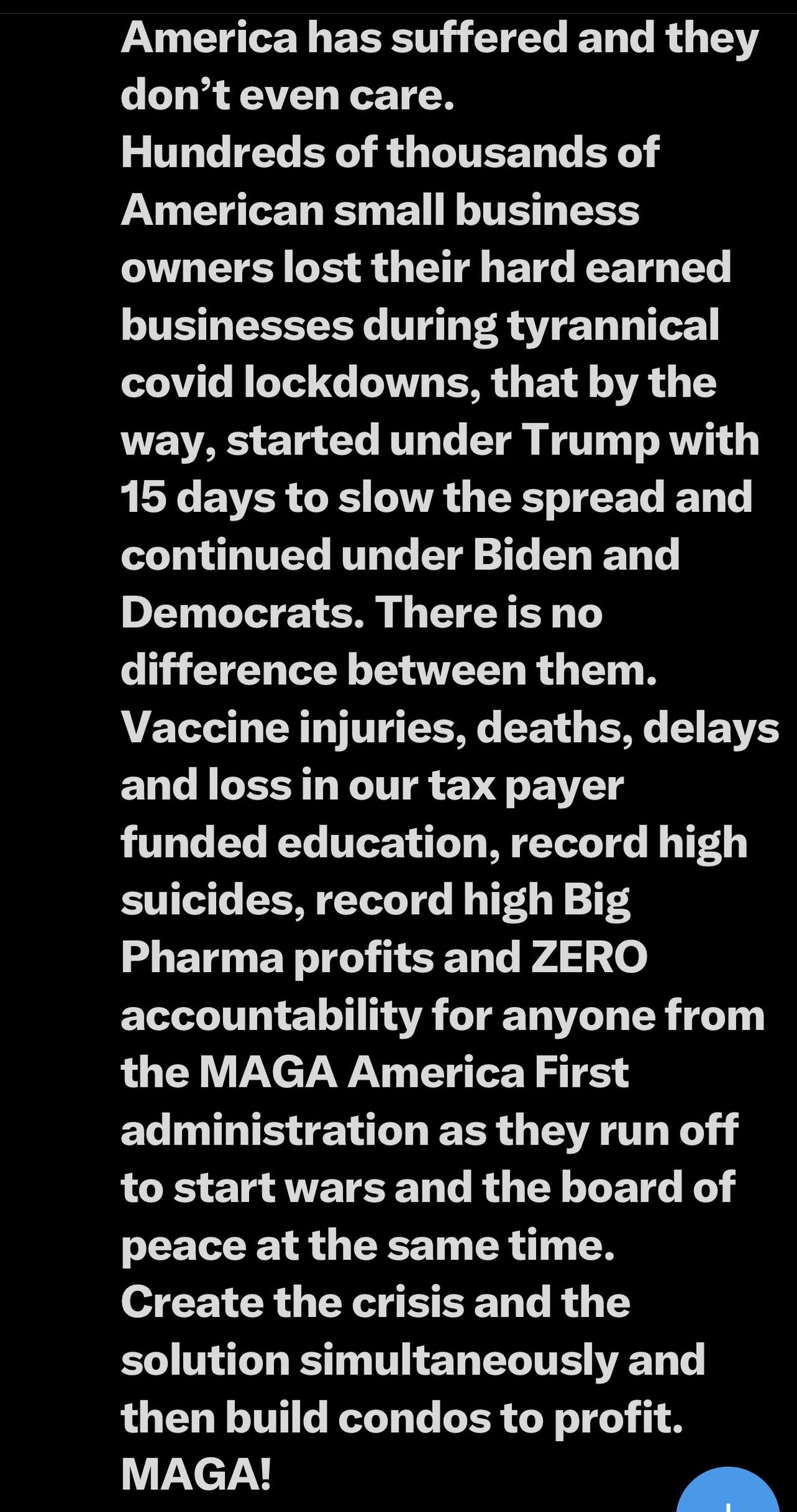 疫苗造成的伤害、死亡、延误以及纳税人资助的教育损失,创纪录的自杀率,创纪录的大型制药公司利润,以及“让美国再次伟大”美国优先政府中任何人的零问责,他们一边发动战争,一边又忙于和平事务。