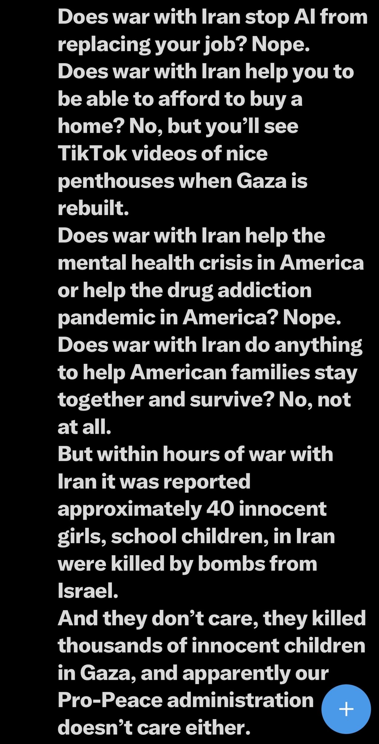 与伊朗开战对帮助美国家庭团聚和生存有任何帮助吗?完全没有。