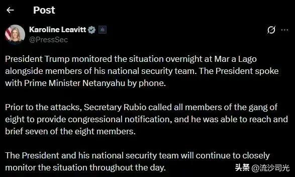 白宫发言人声明:川普总统昨夜在马阿拉歌庄园与国家安全团队成员共同监控局势,并与以色列总理内塔尼亚胡通话。袭击发生前,国务卿卢比奥已致电国会"八人组"全体成员进行通报,并成功联系并简报了其中七位。总统及其国家安全团队将持续密切关注局势进展。 据路透社引述美国官员消息:川普在伊朗遭到打击前已获简报,被告知此次行动属于高风险、高回报的军事行动。 英国宣布加入打击伊朗的行动。 英国首相斯塔默表示:"我们的部队正在行动,英国战机今日已升空,参与协调一致的区域防御行动,以保护我国人民、利益及盟友。"
