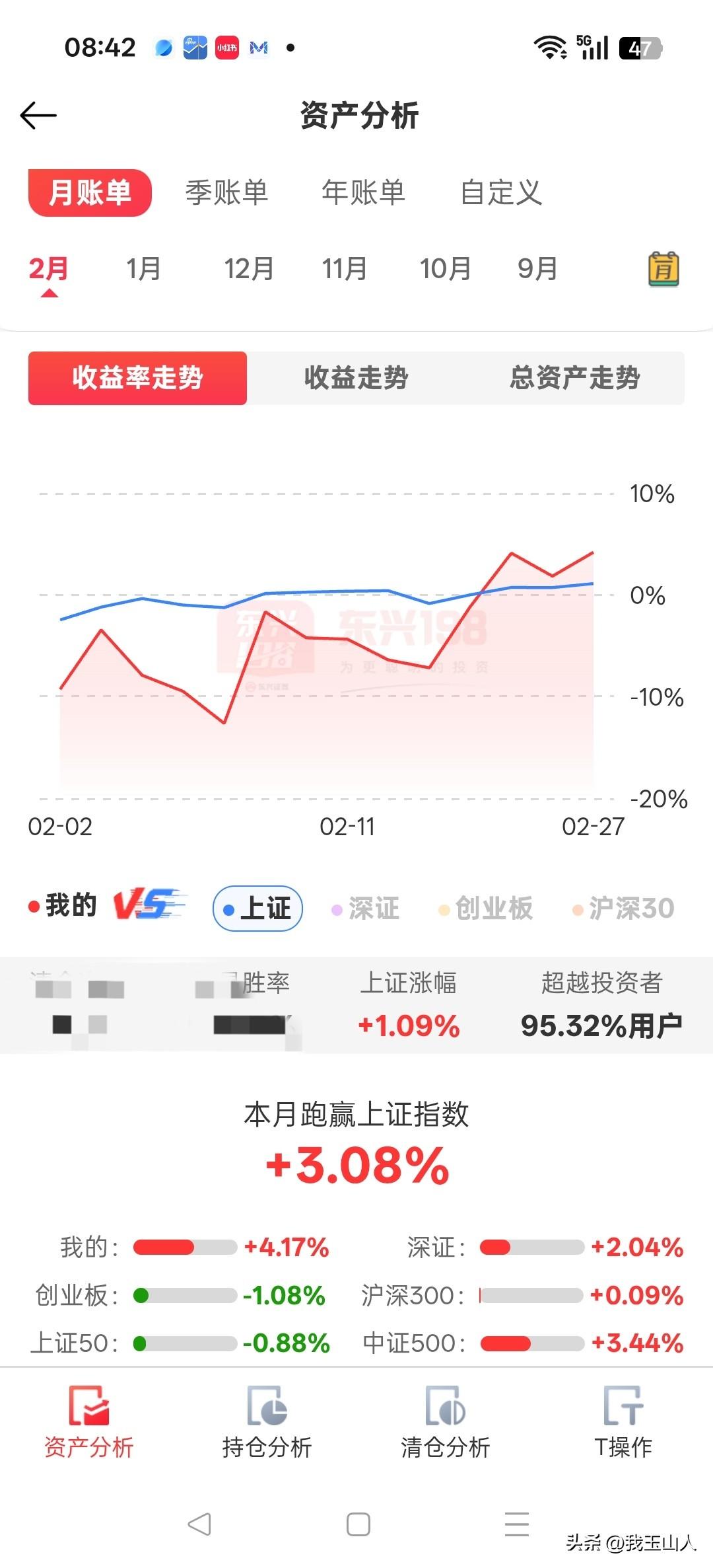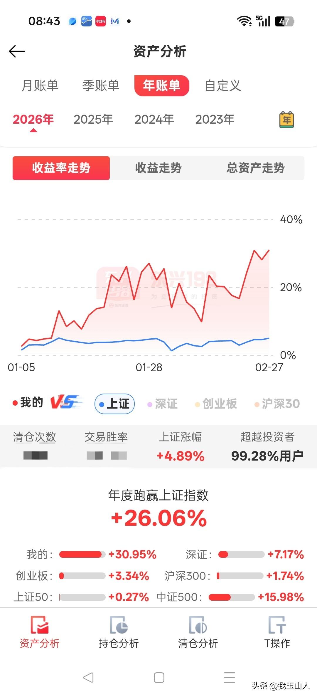 2026年开年小结 1月:战绩较好 - 个人收益率:+25.54% - 上证指数:+3.76% - 跑赢指数:+21.78% - 交易胜率:超越99.40%的投资者 2月:先抑后扬,稳健收官 - 个人收益率:+4.17% - 上证指数:+1.09% - 跑赢指数:+3.08% - 走势:月初经历回调,一度承压,但在春节后几个交易日强势反弹,最终将账户拉红,稳稳跑赢大盘。 年度至今:表现尚可,信心十足 - 个人收益率:+30.95% - 上证指数:+4.89% - 跑赢指数:+26.06%,超越99.28%的投资者 展望3月:积少成多,继续加油💪 母鸡不多,下不了几个蛋。2026年开年还行,知足常乐。期待3月股市长虹,个人收益再创新高,继续稳步前行,积小胜为大胜!