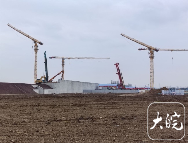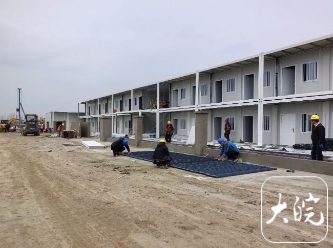 大皖新闻记者看到,在项目部建设现场外围,分别有两批工人正在进行围墙建设,一位正在浆砌墙体的工人师傅介绍说,他们正月初七(2月23日)就复工了,“我们都是本地的,工期催得紧,亲戚都没走完(拜年)就来了。”他说。