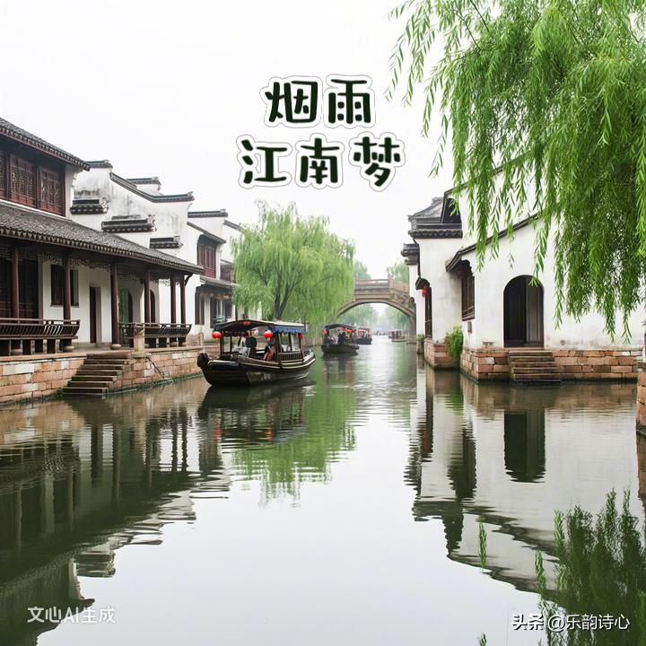 《烟雨江南梦》乐韵诗心原创诗词: 烟笼寒水柳丝柔, 黛瓦白墙映碧流。 乌篷摇曳波心过, 似入仙乡画里游。 这首诗词描绘出江南水乡被如烟细雨笼罩,寒水之畔柳丝轻柔飘拂的画面,营造出朦胧、静谧的氛围。次句聚焦于江南典型的建筑,黛瓦白墙倒映在碧绿的流水中,色彩对比鲜明,画面极具美感。后两句写乌篷船在波光中缓缓摇曳而过,让人仿佛置身于仙境般的画卷之中,尽显江南的灵动与诗意。
