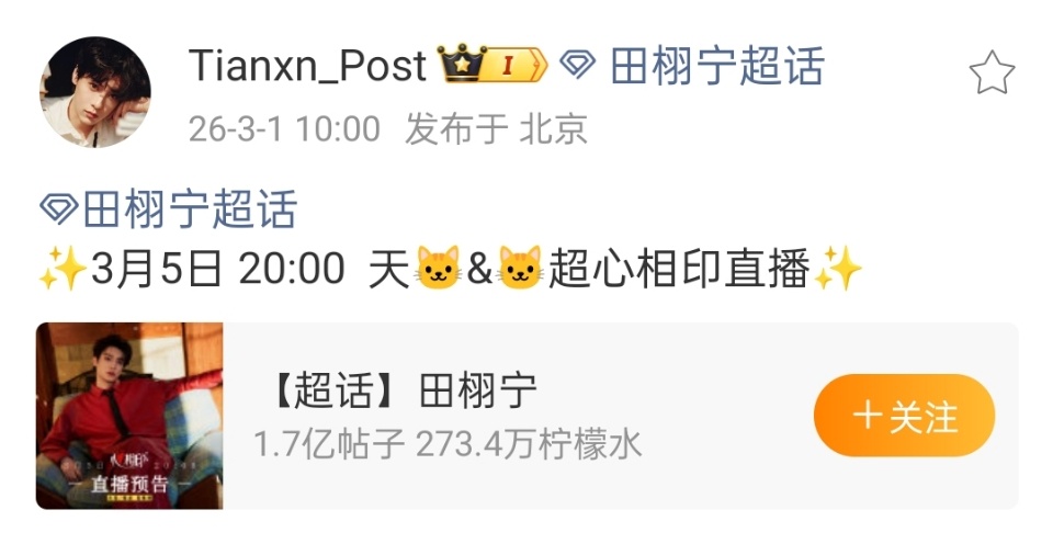 田栩宁心相印直播田栩宁心相印品牌直播预告来了三月第一天的惊喜期待5号晚上见!