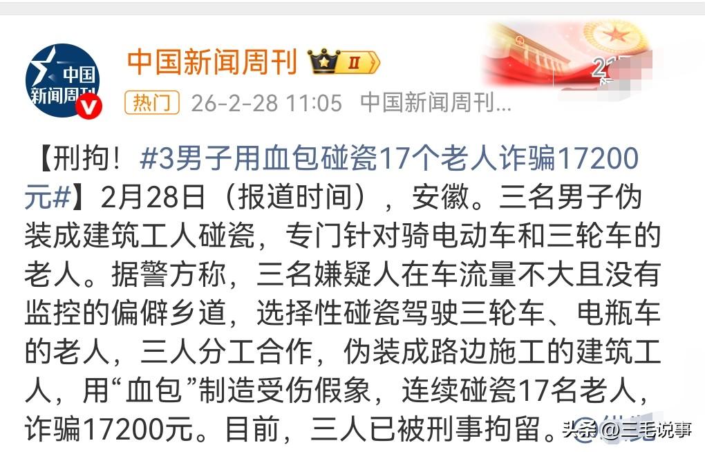 这年头碰瓷的太多了,如果不加以惩治的话那肯定会让这些人得寸进尺,只要碰瓷了,不管有没有成功,那必须让其付出法律的代价,如果这么严惩,看谁还敢碰瓷。 2月28日(报道),3男子用血包碰瓷17个老人诈骗17200元。 这些人太坏了,专门针对老年人行骗。 三人已经被抓,等待他们的必将是法律的惩罚。 一定要让他们坐牢,让他们长长记性。